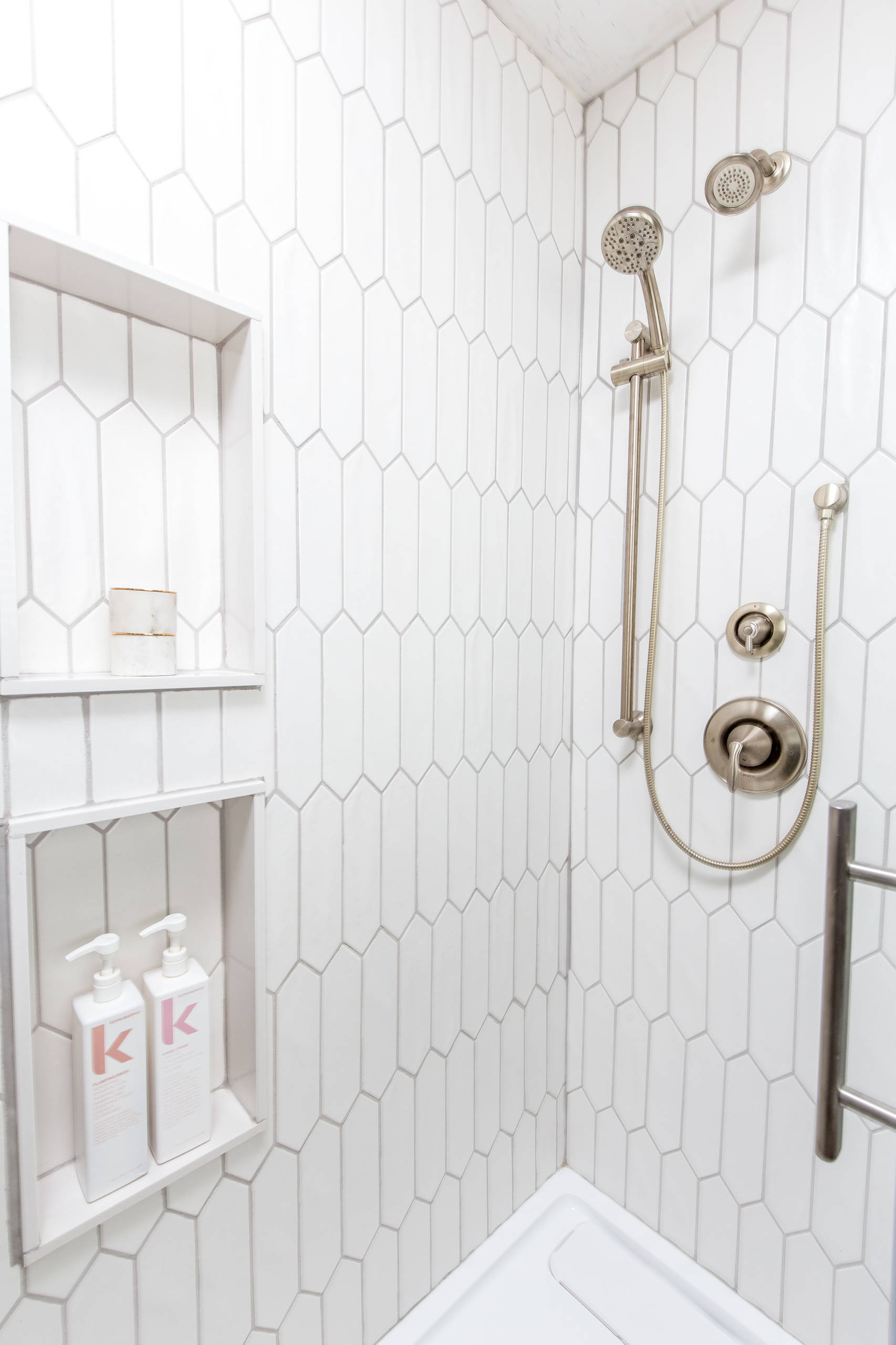 Shower wall tile: matte white, Crayon, Urban Zebra, Tile Town; shower: Kelsey, OVE, Costco; grout: Silverado, Tec