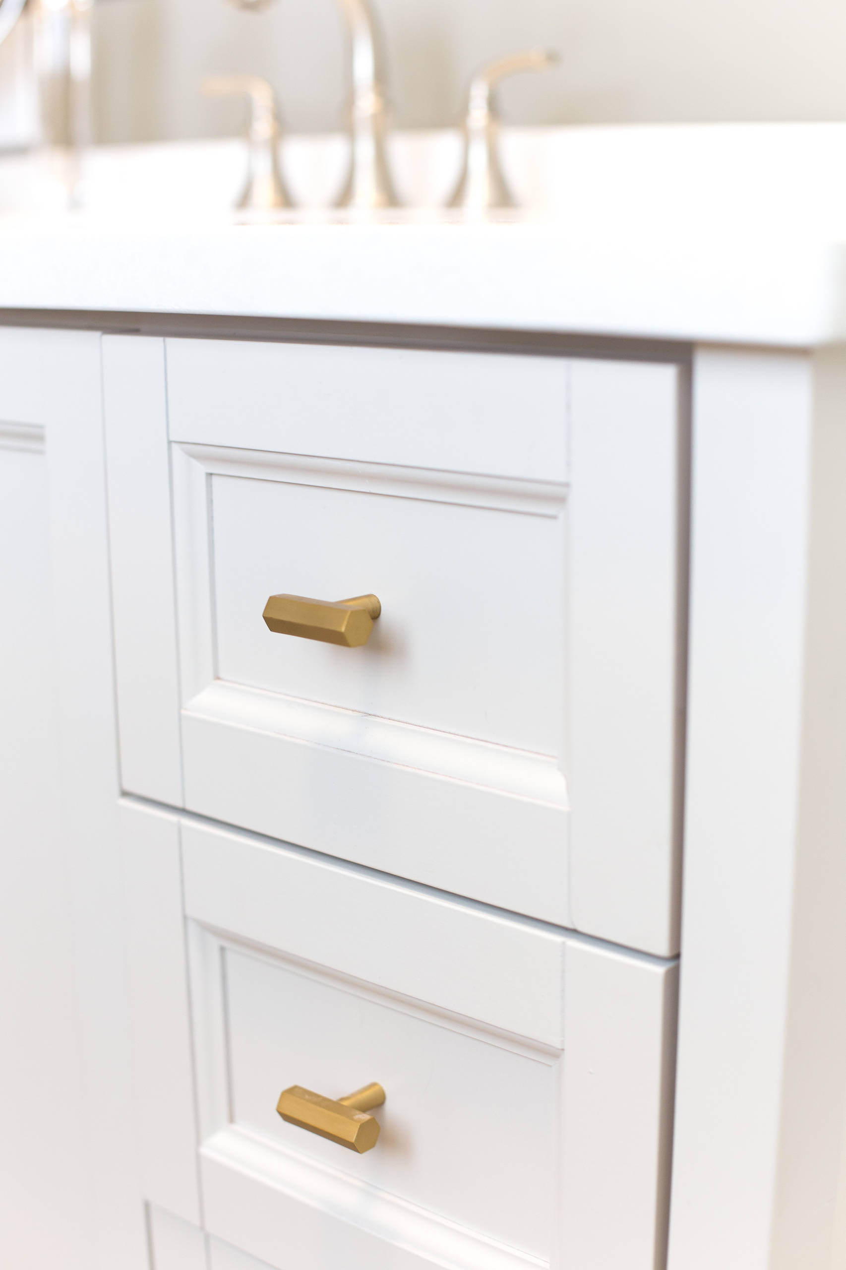 These hex-shaped pulls also reference the wall tiles in the shower.