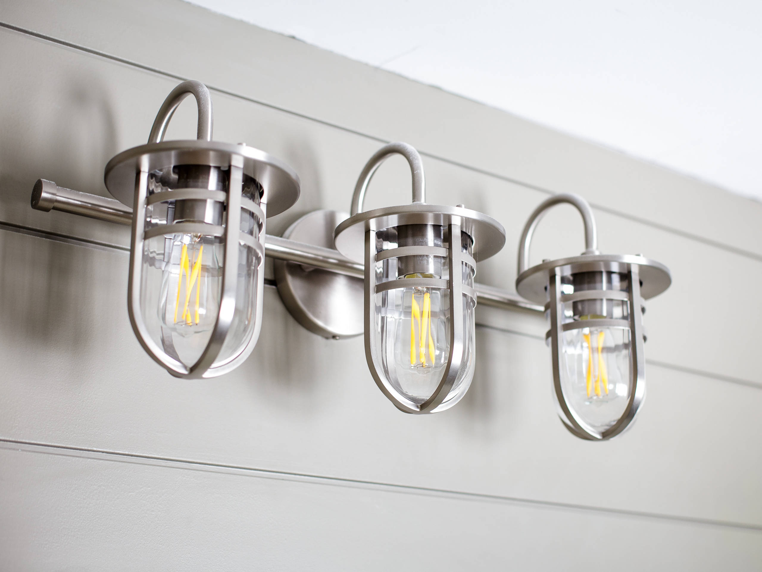 Sconce. Throughout the project, Henry worked to balance natural, traditional and modern design. The three-light fixture is modern, but it mimics the traditional lines of the faucet below. The brushed nickel finish matches the plumbing fixtures in the vanity and shower, and it balances the neutral colors with a little shine.