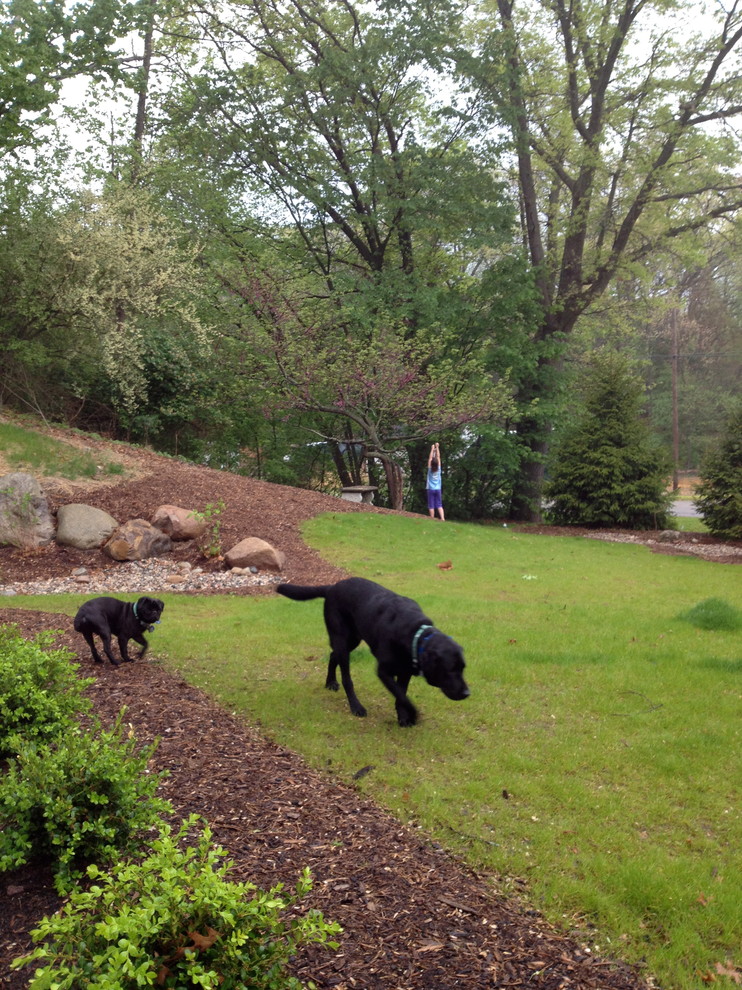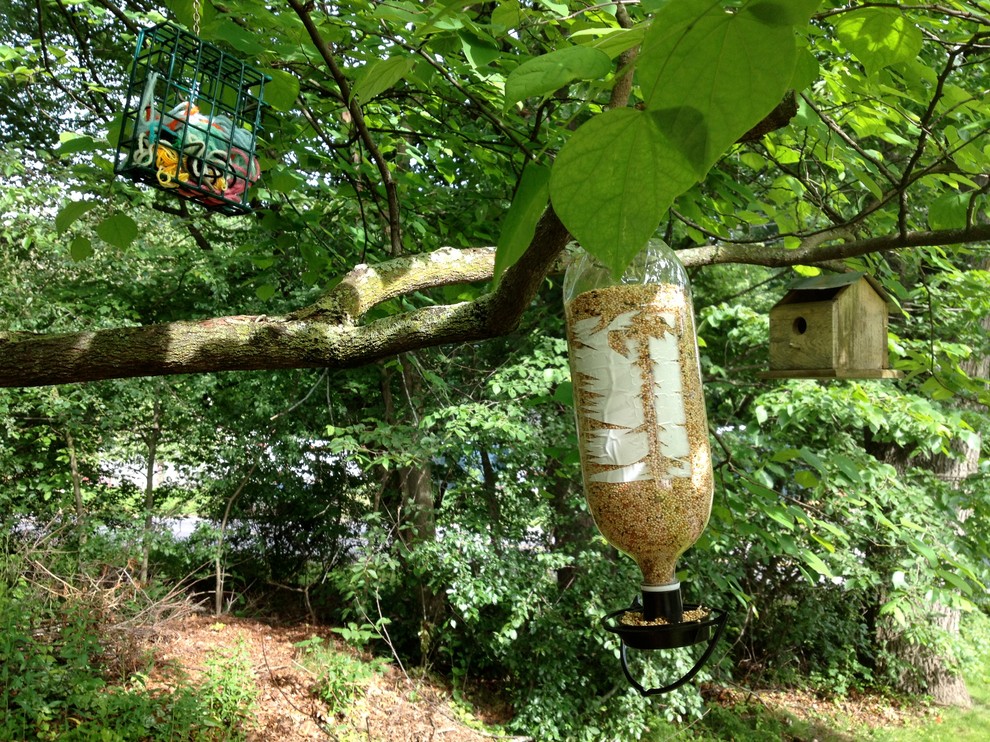 Place the feeder where you can easily see it. My 9-year old-daughter once set up a bird haven in a redbud tree (shown here in the far background) but it was impossible to see from inside the house. Bird-watching can take time and require patience, so the more readily visible your feeder is, the more likely you’ll see a variety of birds.