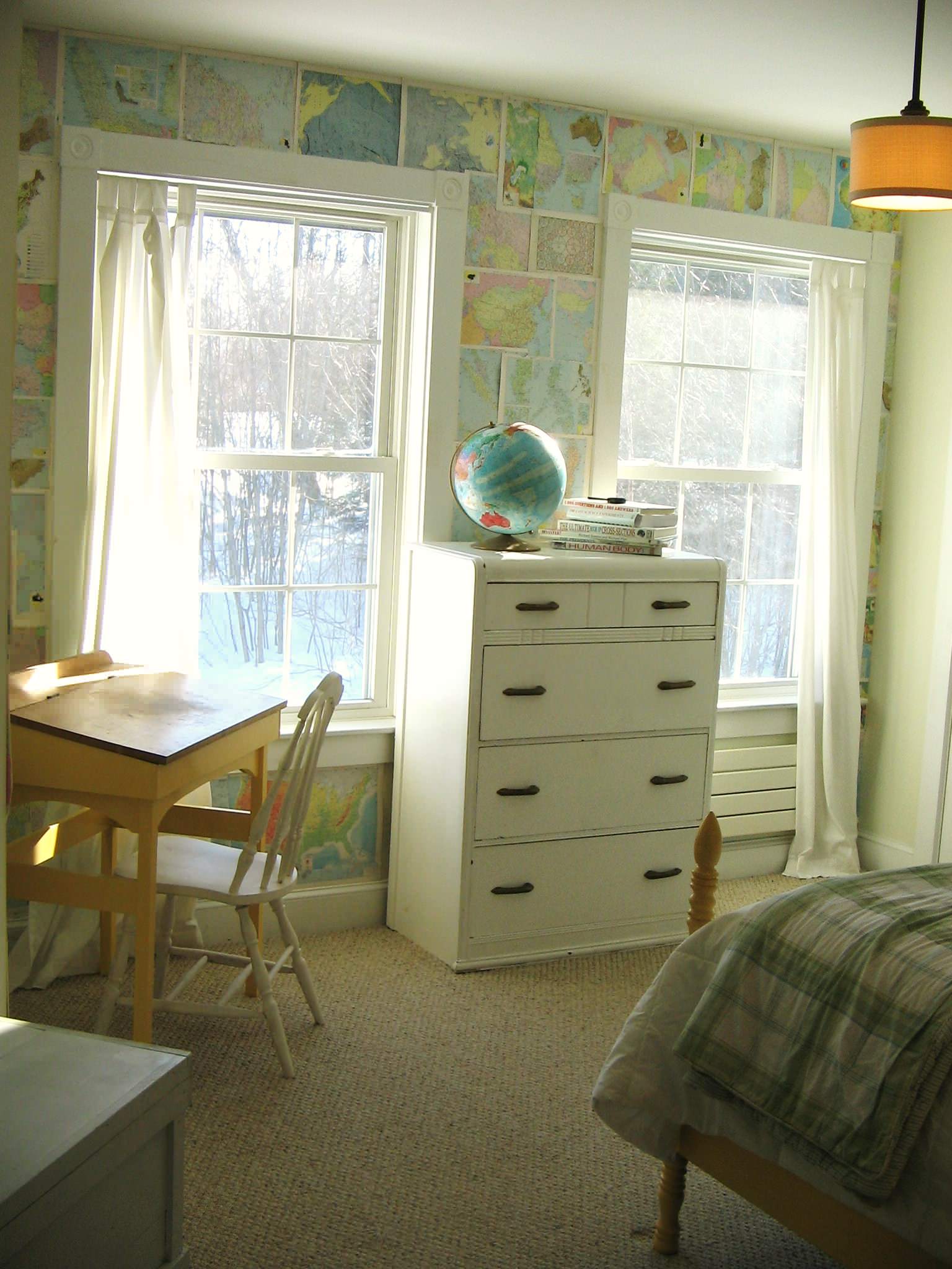 A collage applied to the walls becomes a unique wallpaper here, and the globe on the dresser plays off it nicely.