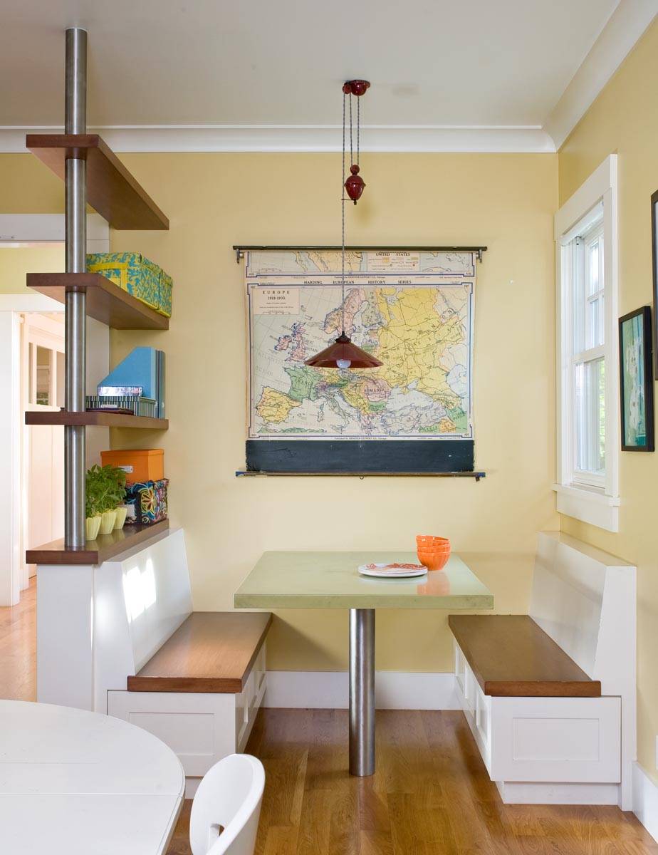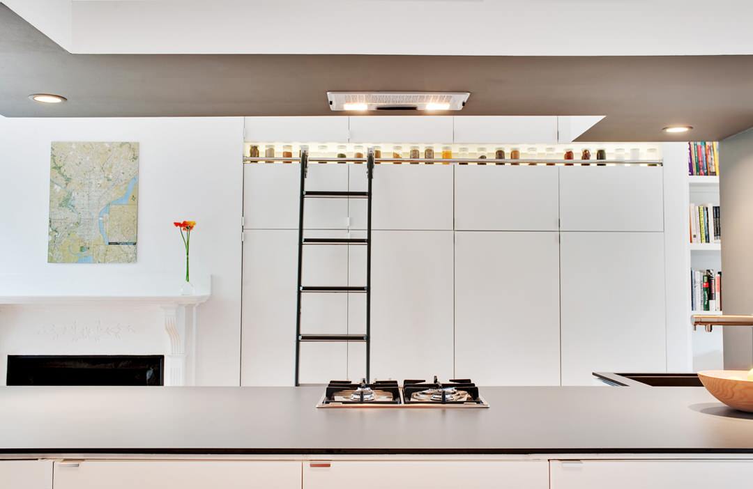 In this minimal white-box kitchen, the graphic design of the map grabs attention.