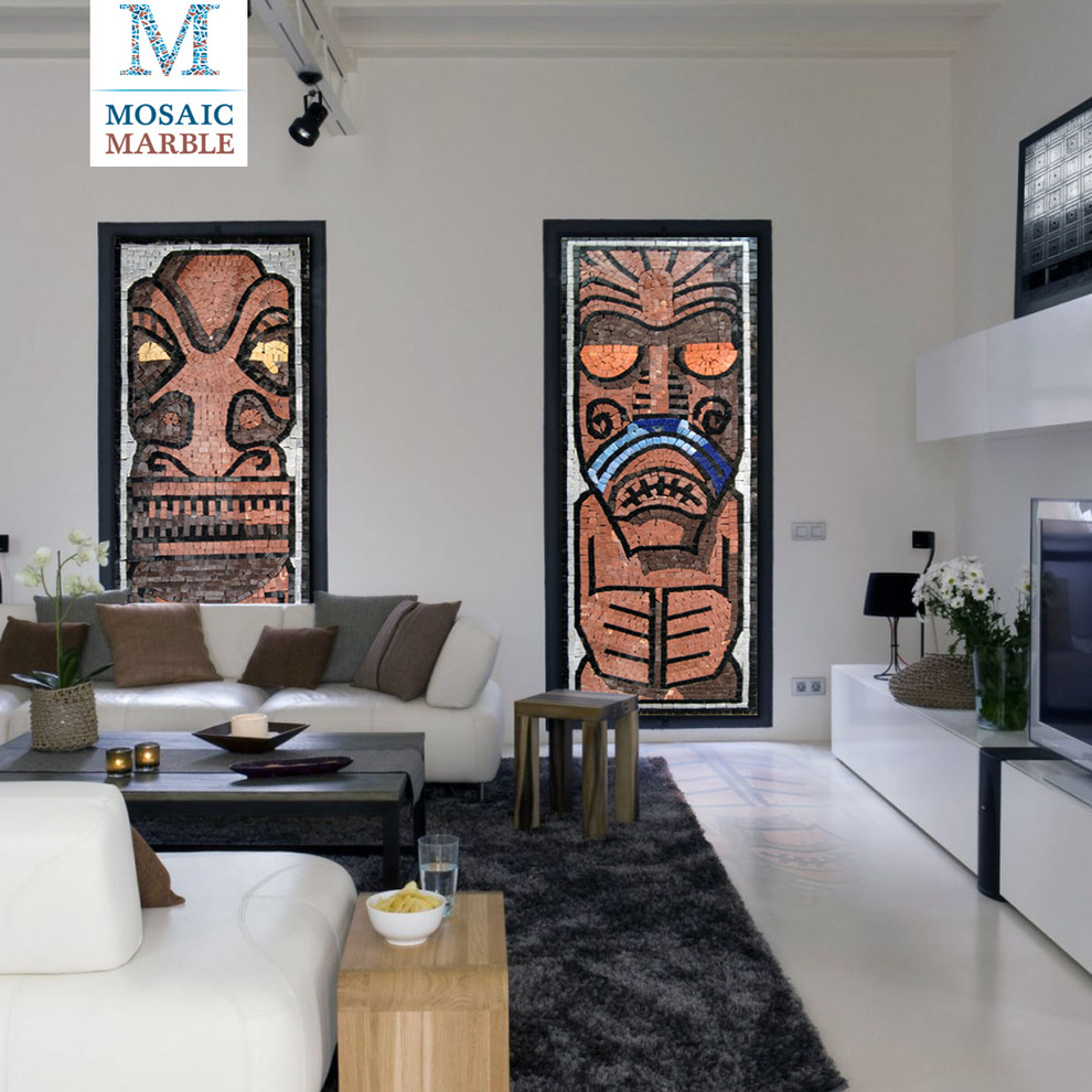 While tiki culture as we know it is as authentic as Velveeta, tiki totems are the real deal. Indigenous islanders, including the large Maori population of New Zealand, carved elaborate humanoid features in cylindrical posts, commonly to immortalize an ancestor or mark a burial site. In this living room, marble mosaics bring two tiki figures to life.