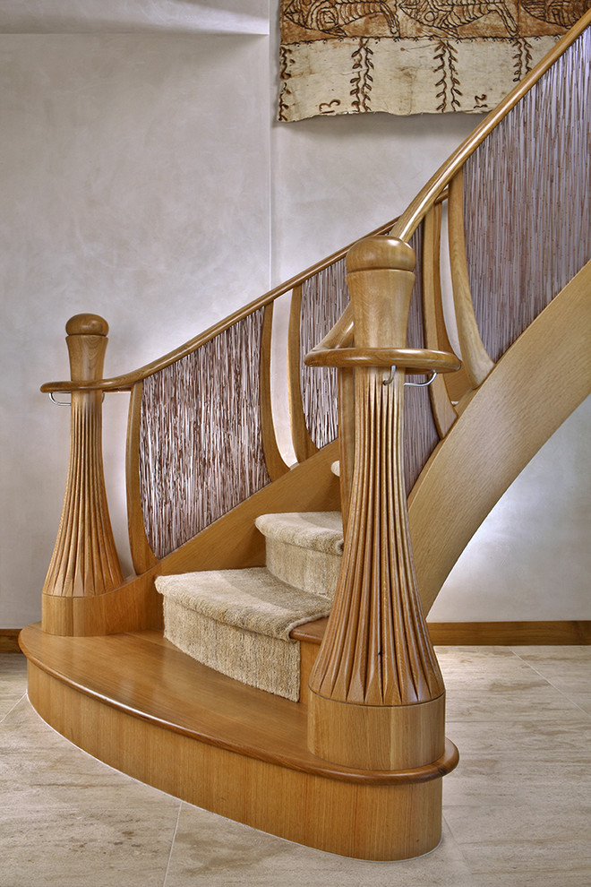 With its hula-skirt newel posts and bamboo grass eco-resin panels, this custom staircase by Gauge Design Group is delightfully South Pacific and the epitome of tropical glamour.