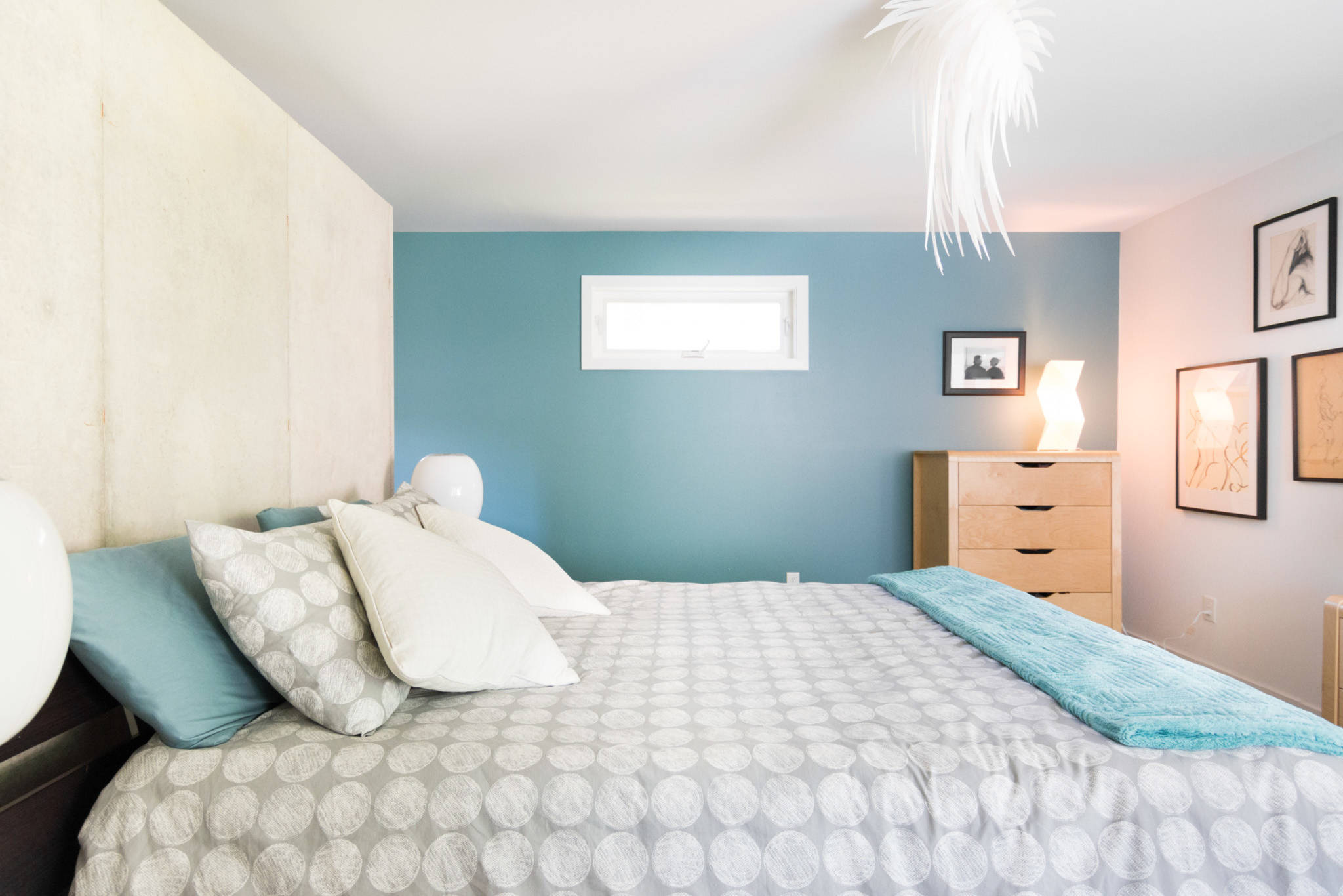 The wall color continues onto the bed in the form of a blanket and pillows. These help create a calm and cohesive look in the space.