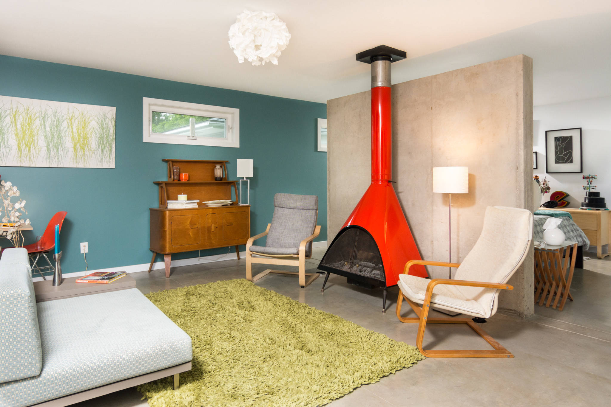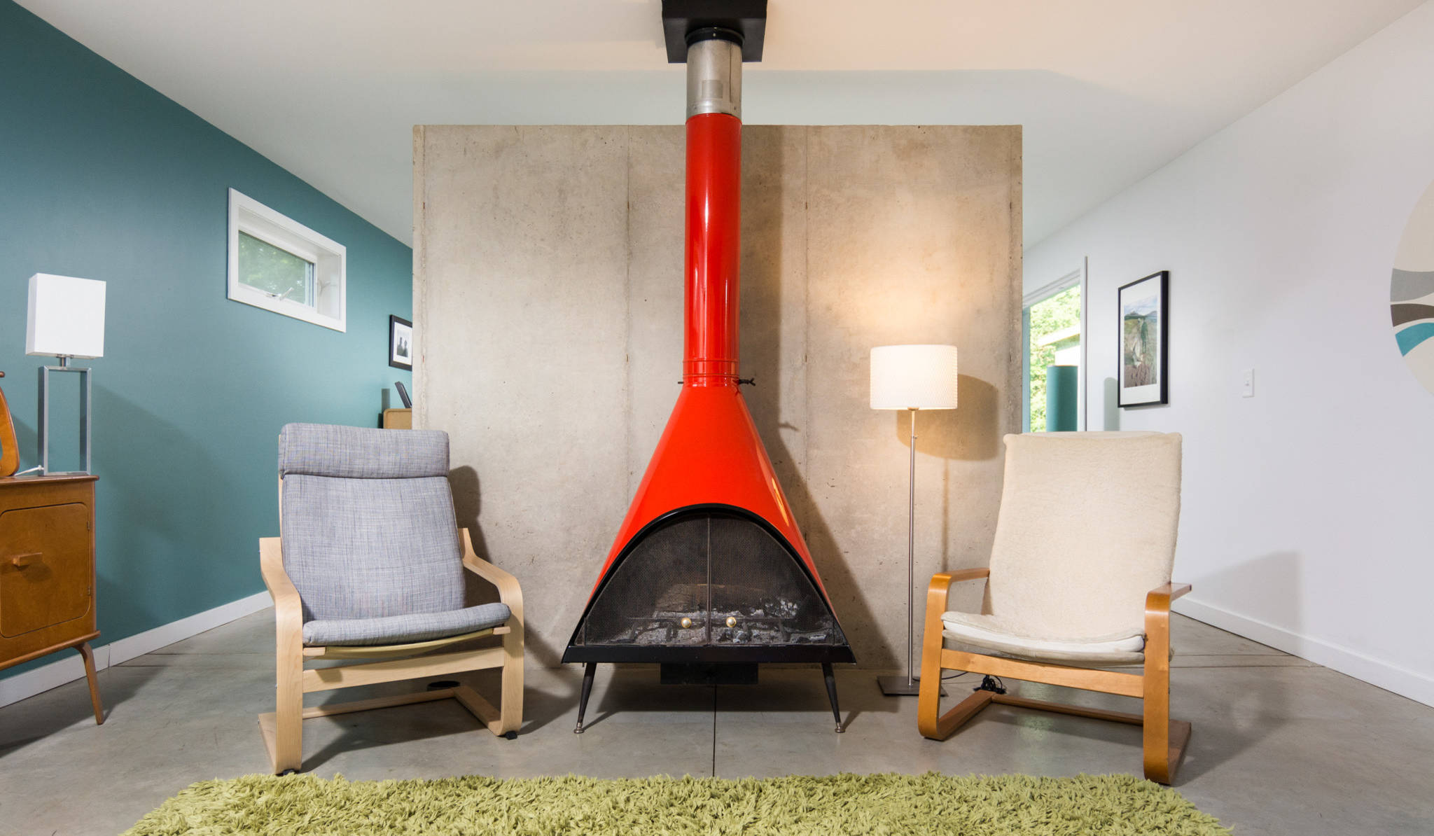 Rug: J.C. Penney Co.; chairs and floor lamp: Ikea; browse midcentury floor lamps