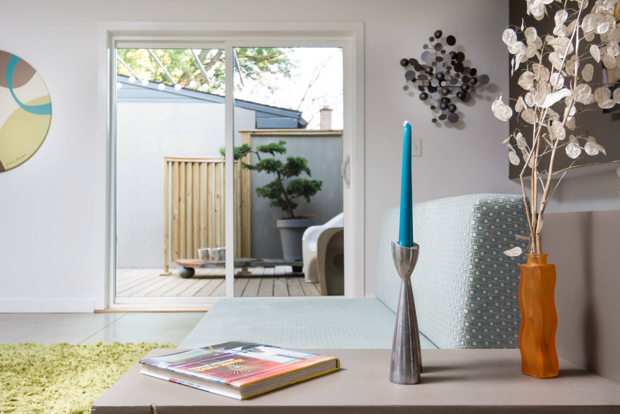 Outdoor area. Past the blue-and-white sofa, sliding glass doors bring in light and give the couple easy access to their new patio.