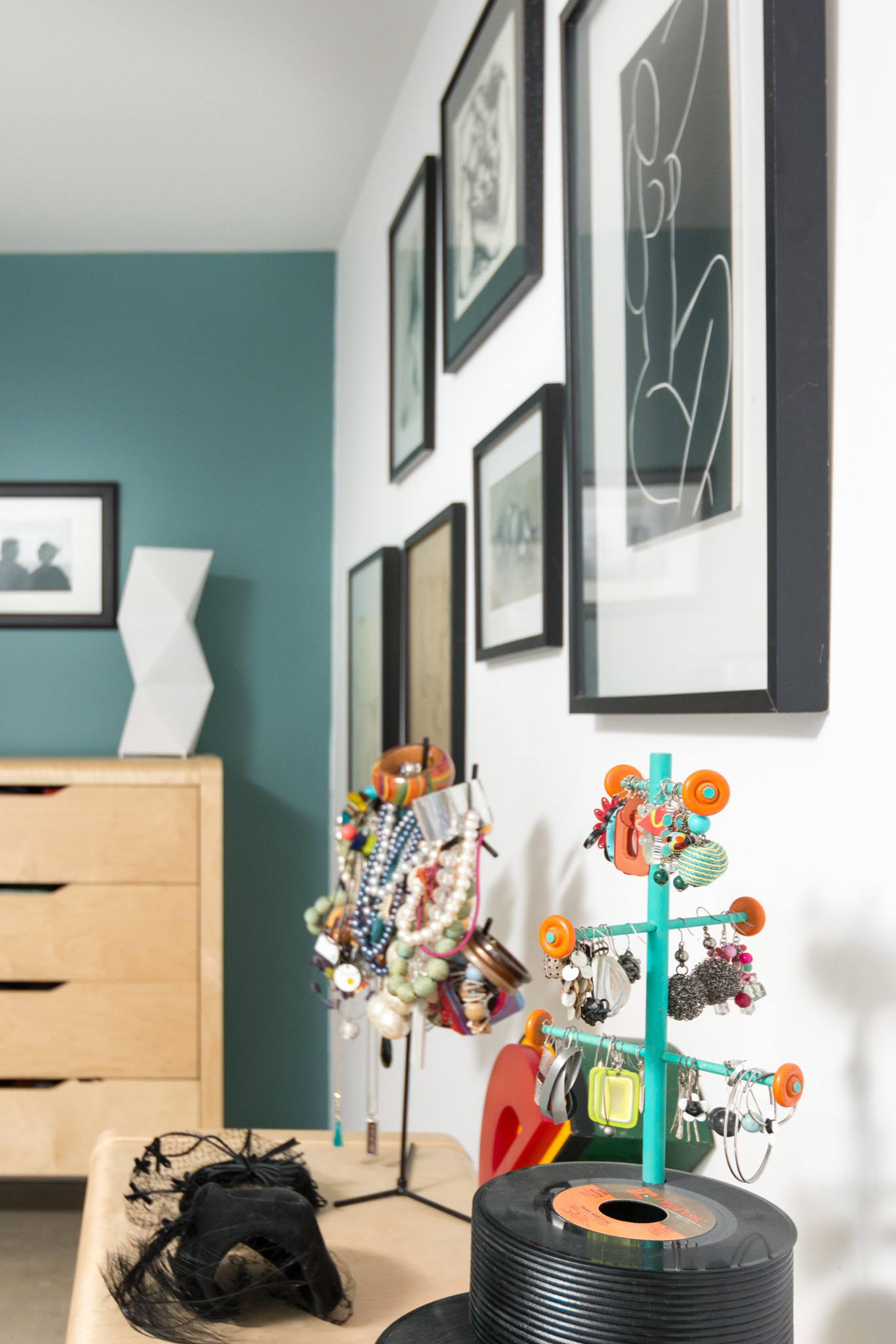 Decor. Walters wanted the bedroom to feel fun and whimsical, so she displays only items that give her that vibe. That includes these handmade record jewelry racks created by her stepdad.