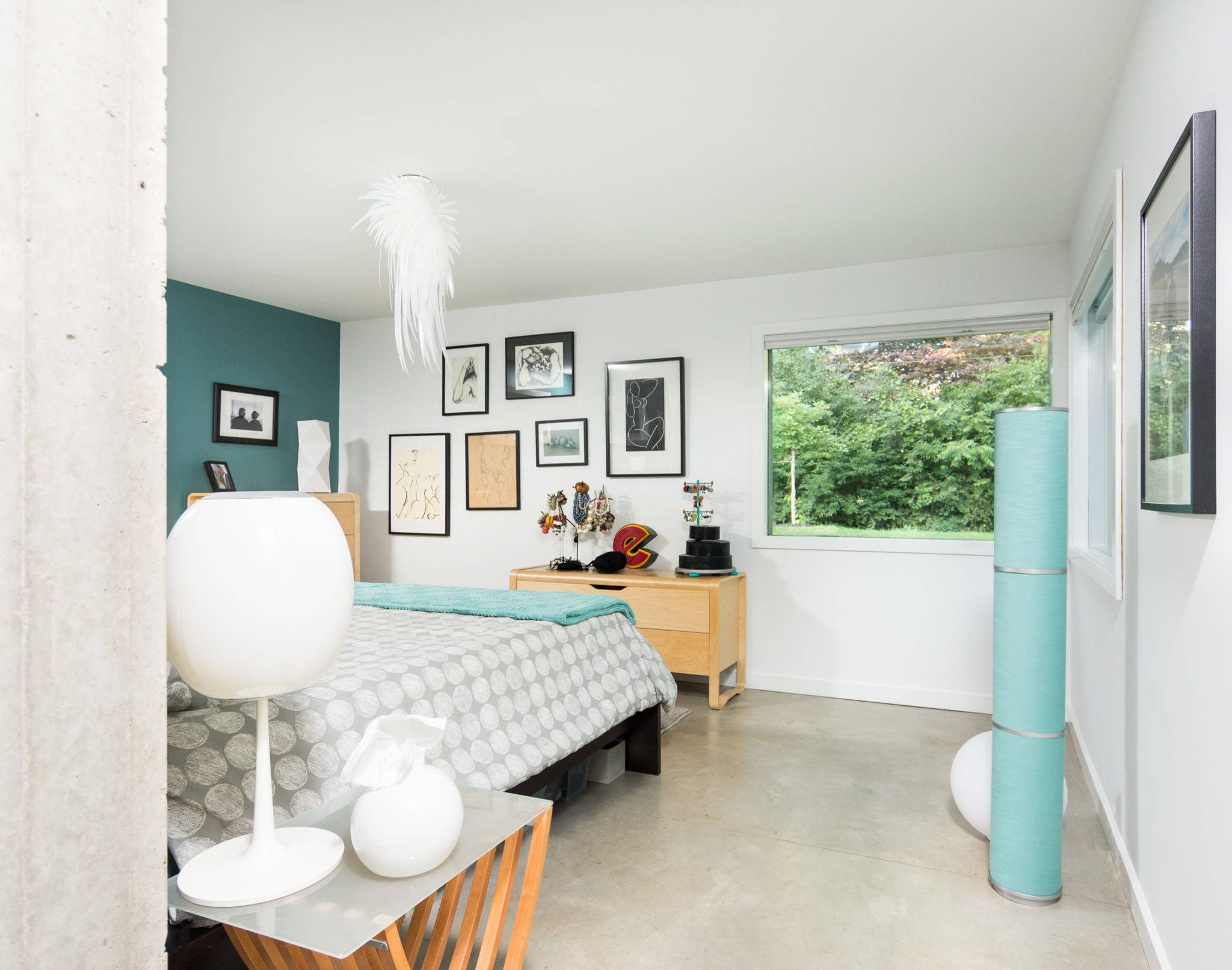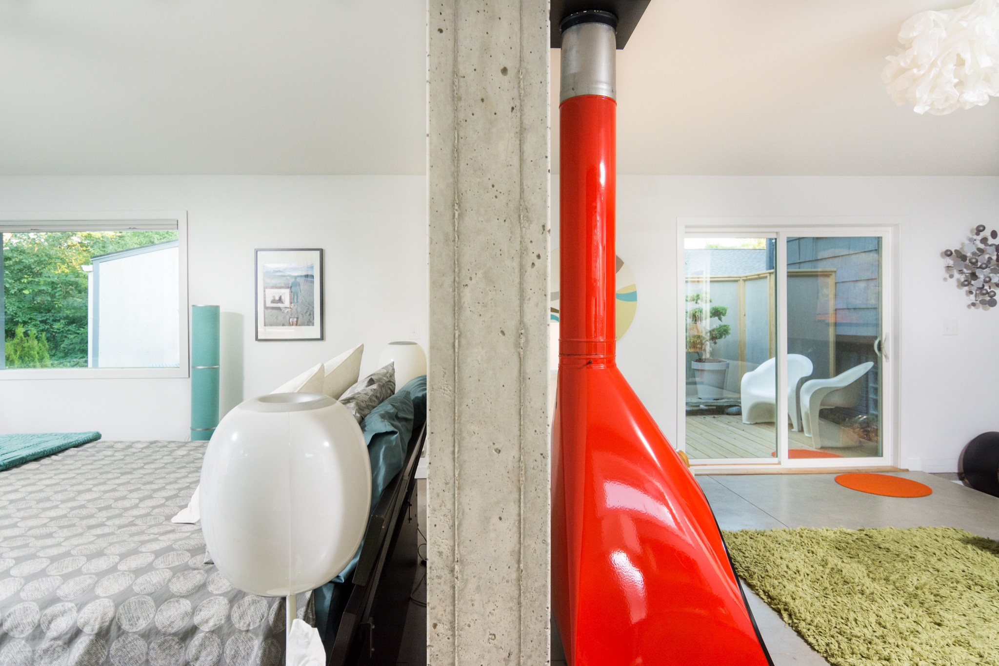 Cohesive design. Walters painted the entire back wall of the addition the same color. This makes the bedroom and the living room feel connected even though they’re divided by a wall.