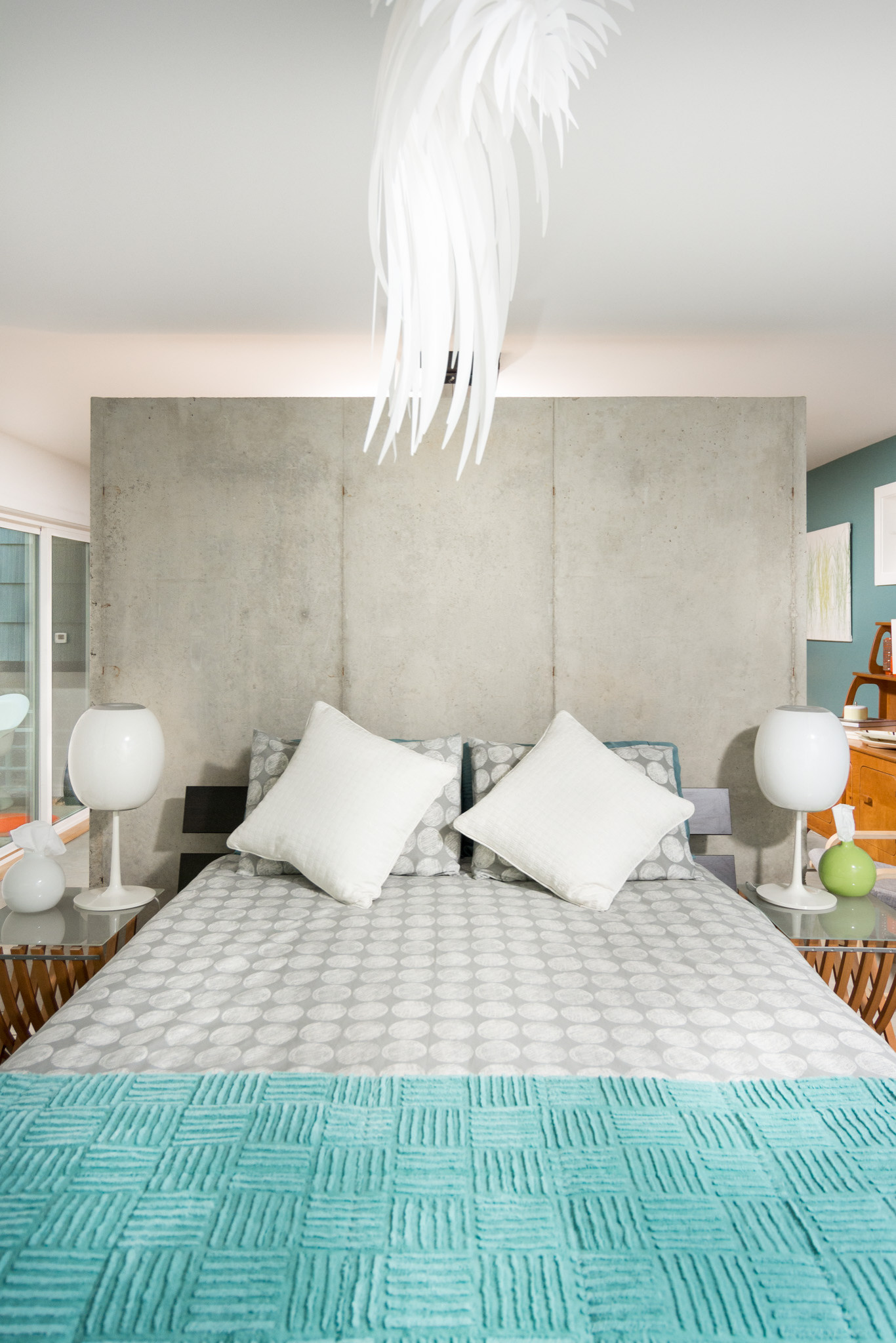 Concrete wall. On the other side of the wall from the headboard is a vintage fireplace in the addition’s living room.