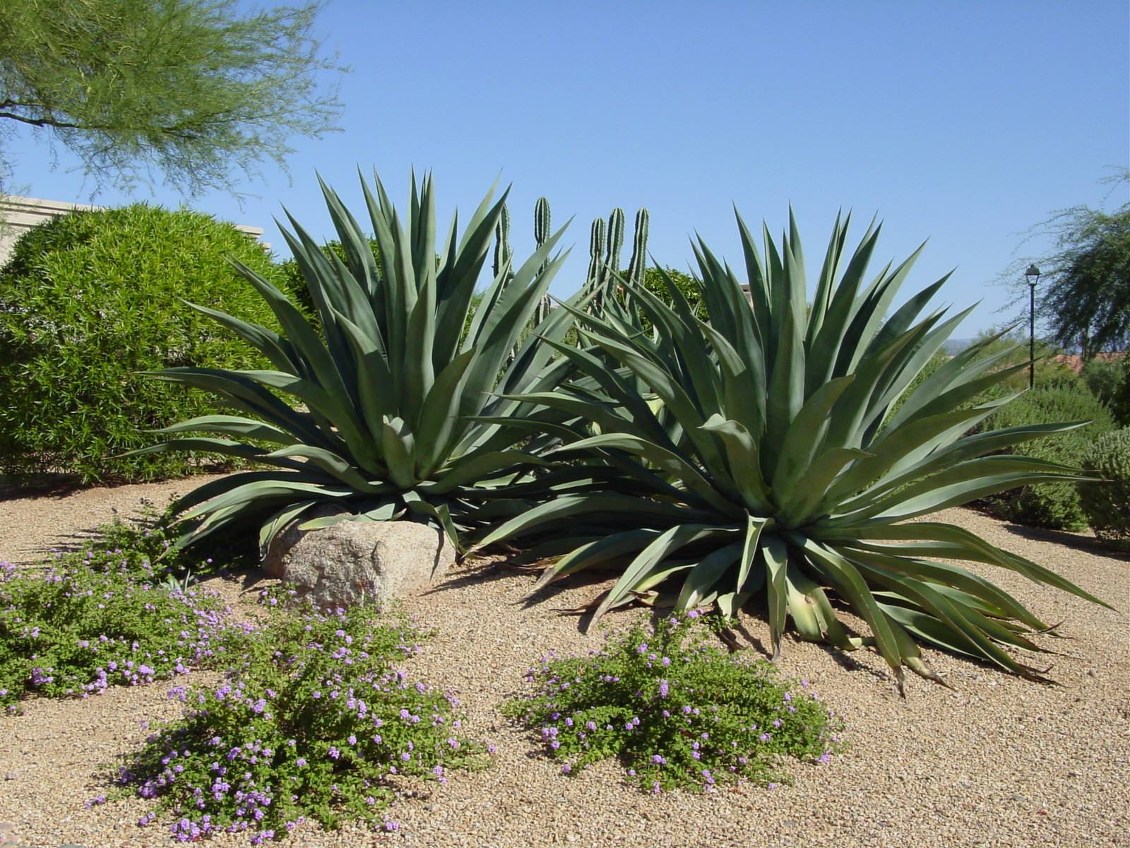 A row of Weber’s agave with pink-blooming ‘Garnet’ penstemon (Penstemon ‘Garnet’) behind