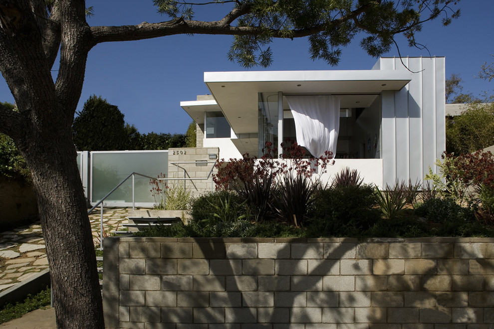 This home is by architect Nathan Kipnis, who has spent the last several decades designing homes that rely on the sun for heating and other power needs. In this home, Nate orients the long face on an east/west axis to make sure that the home gets a lot of sun throughout the day. The design incorporates a deep overhang and pergola to block the sunlight from entering the home in summer, when the sun is higher in the sky.