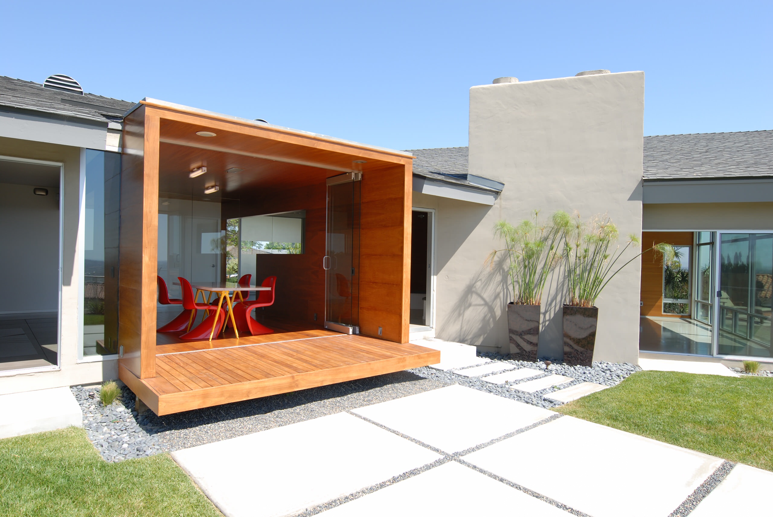 As I browse through the thousands of photos on Houzz, I tend to notice certain formal trends. One in the modernist vein is what I'm calling portals. These are exterior elements — walls, floors, roofs — that extend past the exterior wall to create deep frames. The reasons for this expression are varied, but they come down to a few goals: framing a particular view, providing shade and cover or making a statement.