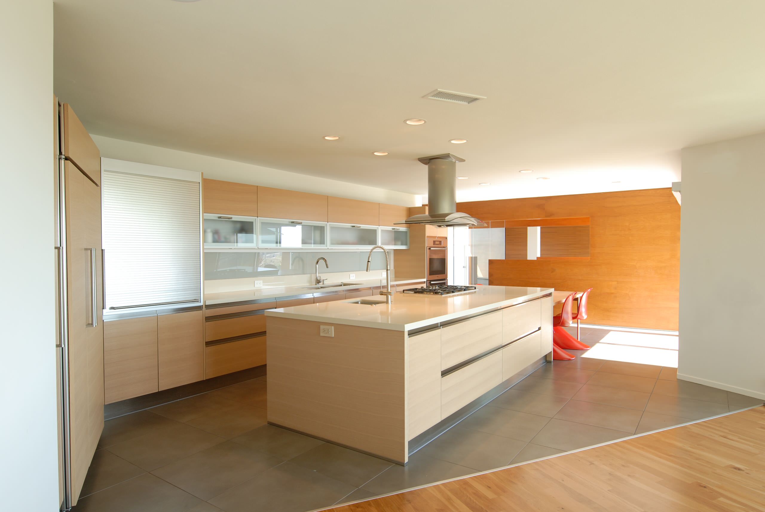 Up close we can see that it serves the dining room. A sliding glass wall nicely extends this space to the exterior.