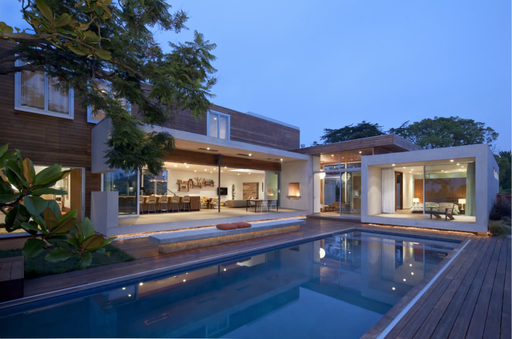 The large portal (the span is large enough to require an additional column) serves the living area. A sliding glass wall unites the indoors and the terrace overlooking the pool. The side walls are cut, one side incorporating a fireplace.