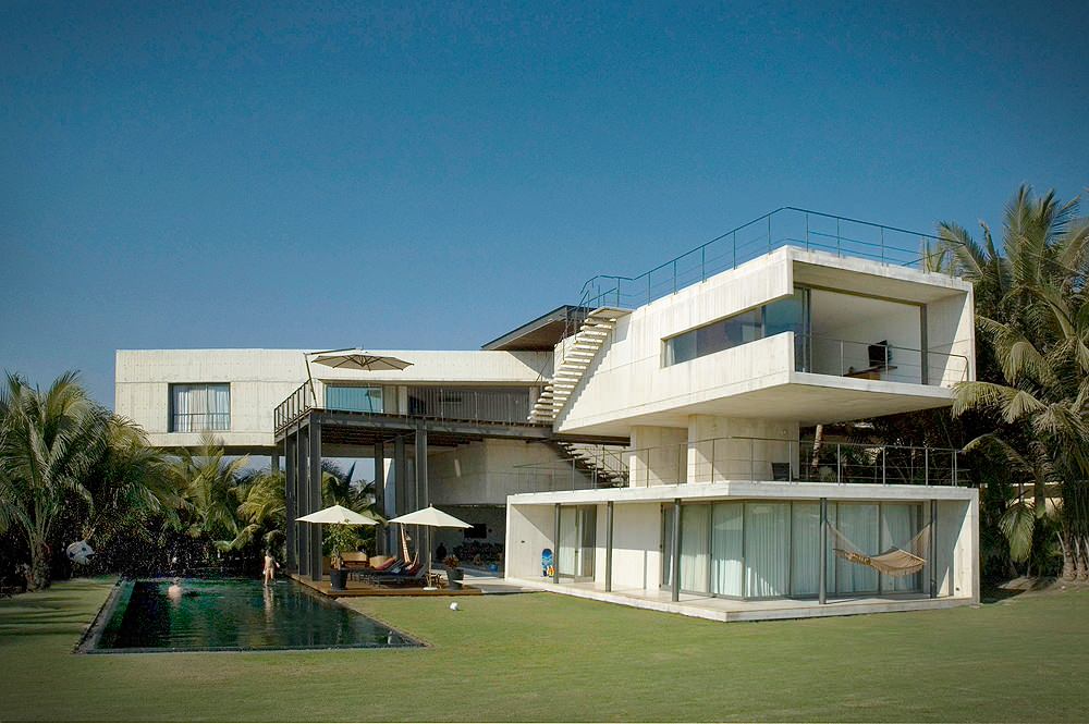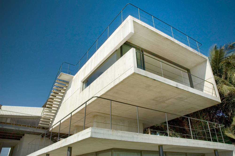 This beach house in Mexico utilizes a portal on the top floor; the cantilevered volume creates a covered terrace below it.