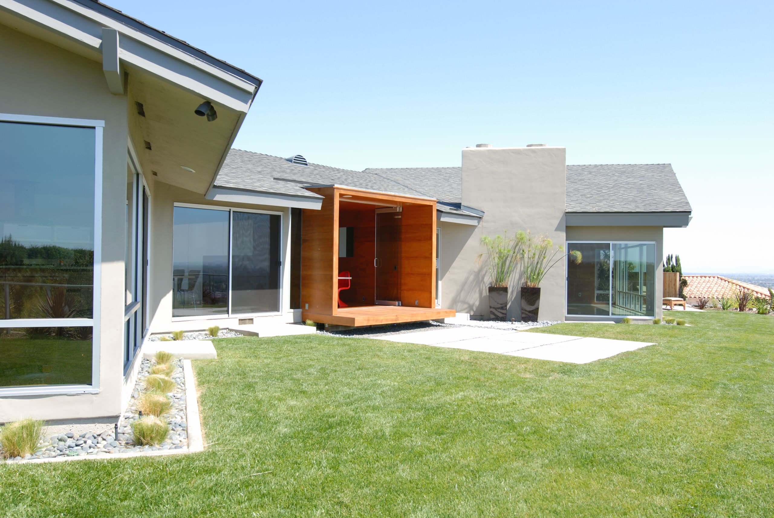 Here is a portal that is inserted into an existing house as part of its remodel. The central location and its materials make it stand out.