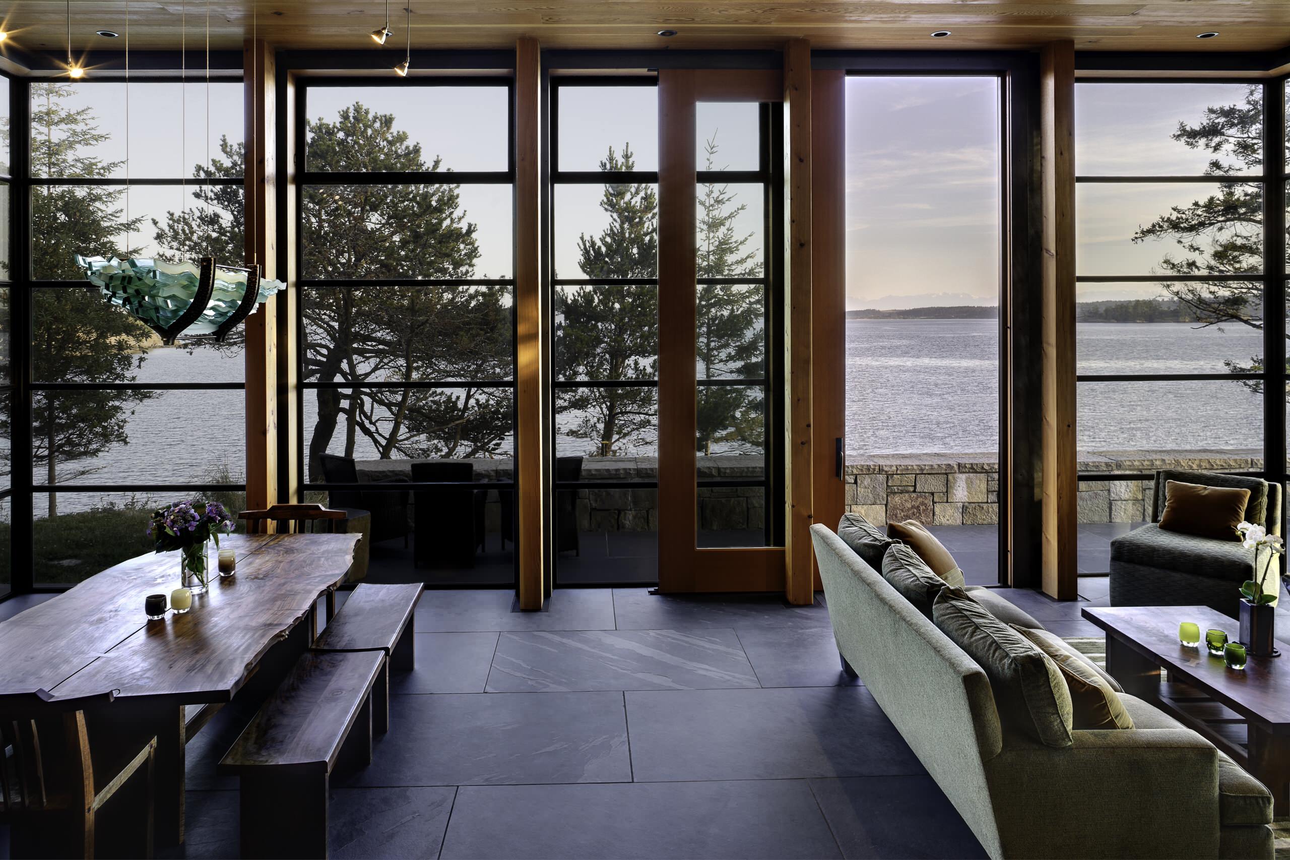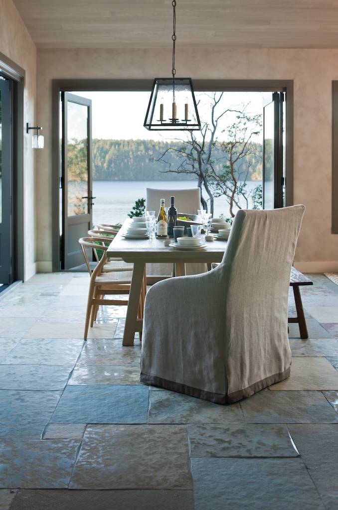 Stone used indoors and out creates a seamless flow. If you crave indoor-outdoor flow, using the same stone inside the house as outdoors is a great way to connect the two spaces. Especially when the stone is paired with large windows and sliding glass doors — or even a pivoting wall, as shown here — the effect is stunning.