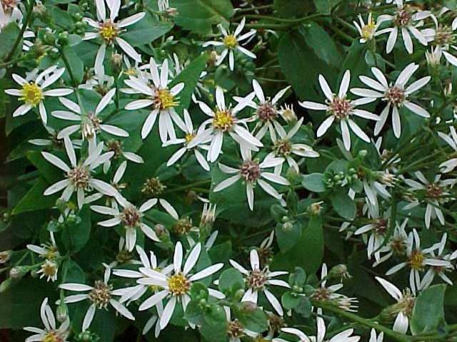 White woodland aster (Aster divaricatus) is native to the East Coast and takes dry soil in full shade (the common name is a giveaway). It blooms about the same time as A. azureus, so it's nice to have both plants — one blooming in sun, one in shade. It reaches about 12 to 18 inches tall and wide, and looks great massed in groups of three.