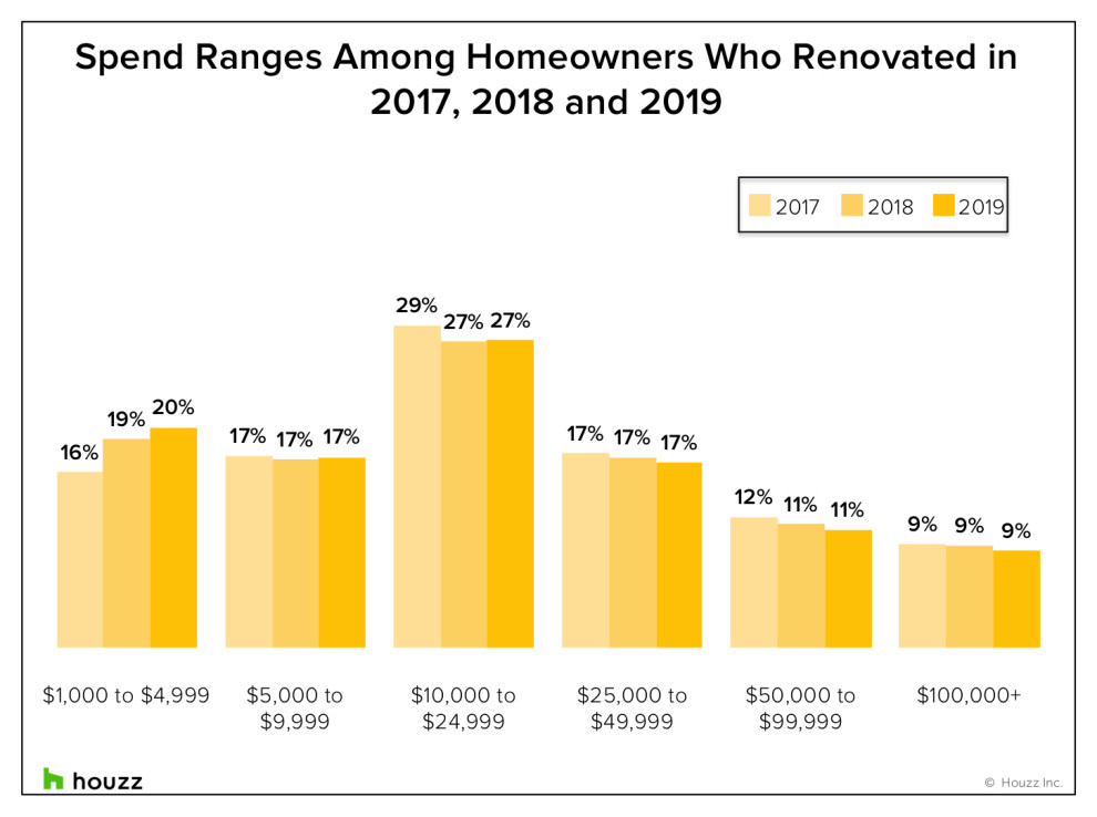 Renovating homeowners spent anywhere from $1,000 to more than $100,000 on their projects in 2019. These figures reflect both DIY projects and those done with professional help.