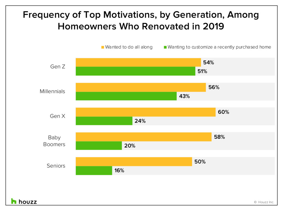 Motivations for undertaking a renovation in the first place varied across the generations in 2019. Baby boomers were more likely to renovate because they had wanted to all along (58%) than because they had recently purchased a home and wanted to customize it (20%). The same pattern held true for Gen Xers, 60% of whom had wanted to do the renovation all along and 24% of whom did it to customize a recently purchased home.