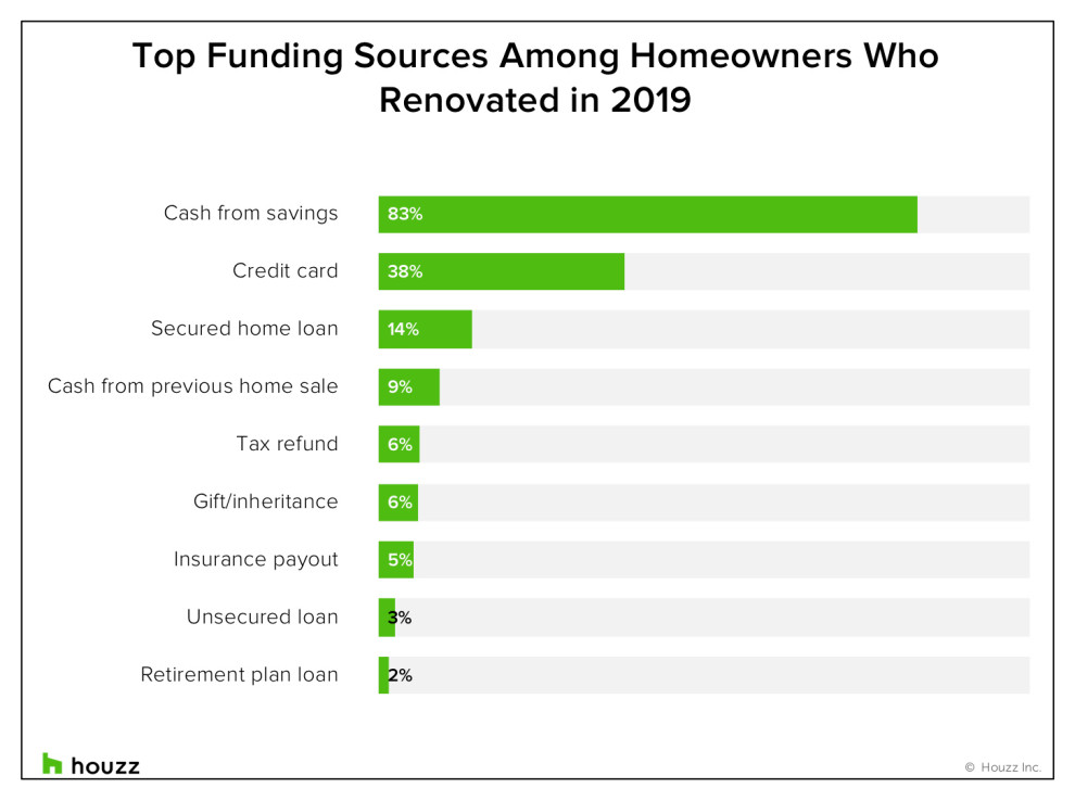 Cash from savings remained the top funding source (83%) among homeowners who remodeled, even in projects with a higher spending amount (over $50,000). Credit cards were the second choice (38%) to pay for home renovations in 2019.