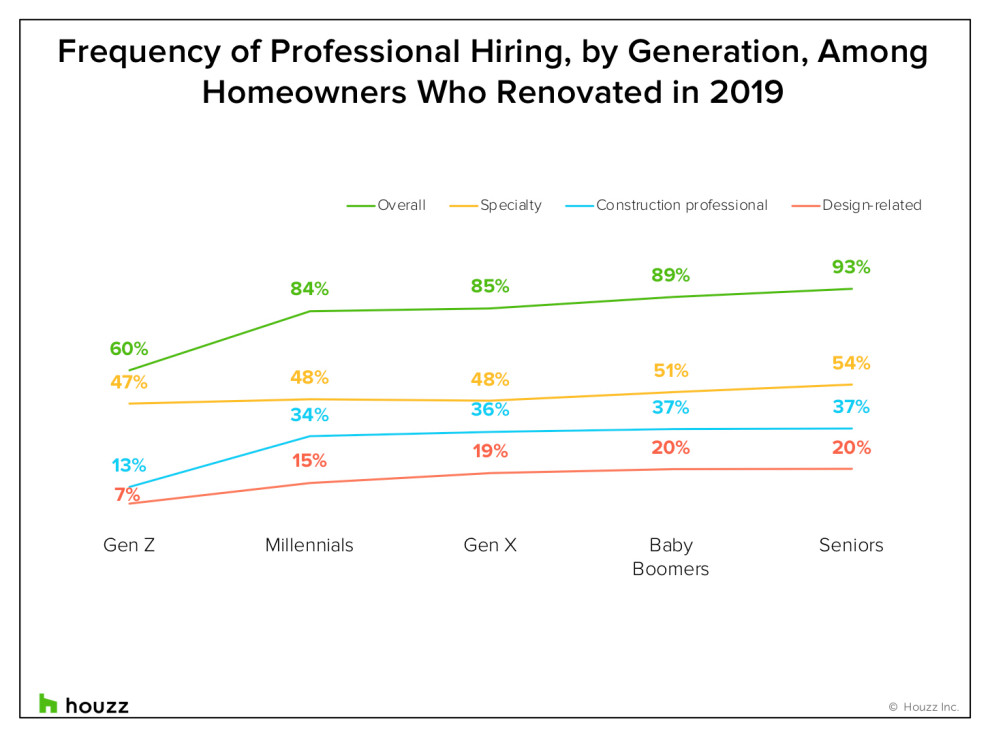 In 2019, 93% of seniors hired pros and 89% of baby boomers did, while 85% of Gen Xers and 84% of millennials did.