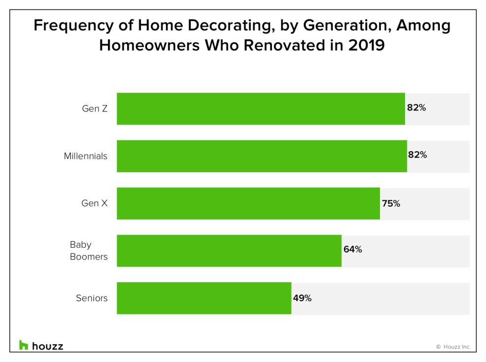 Most homeowners who renovated in 2019 decorated their homes after the renovation was completed. But younger generations were more focused on decorating compared with older generations. Eighty-two percent of millennials decorated after renovating, whereas only 64% of baby boomers and 49% of seniors did.