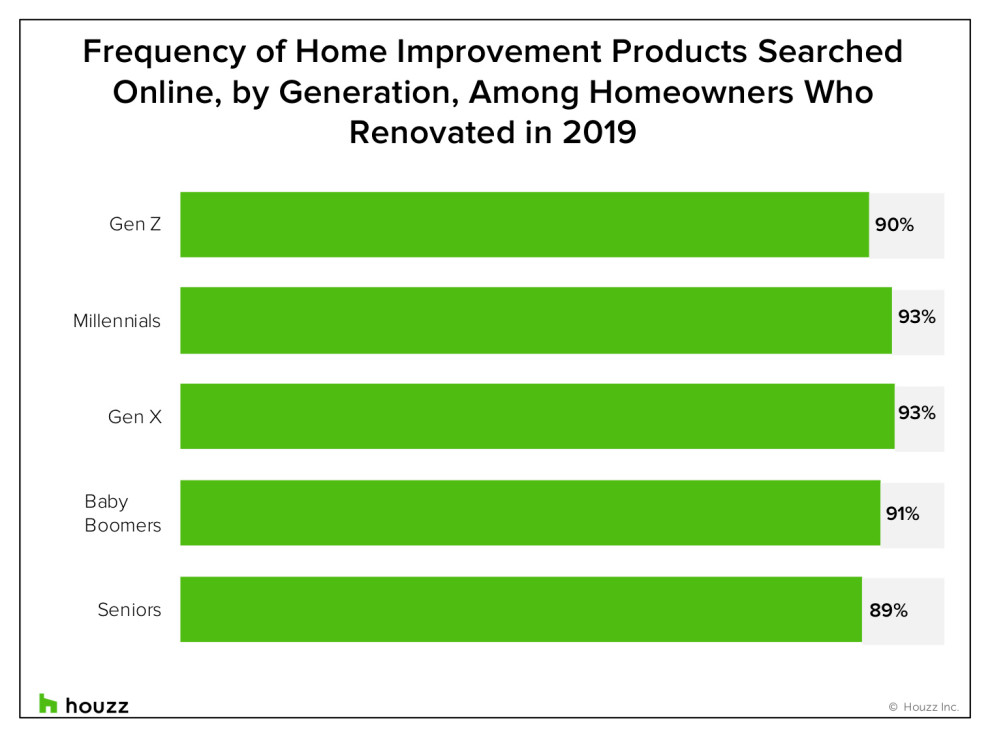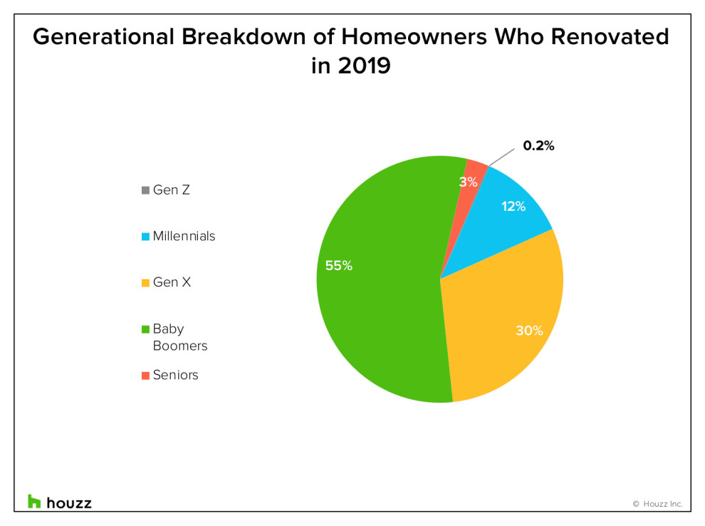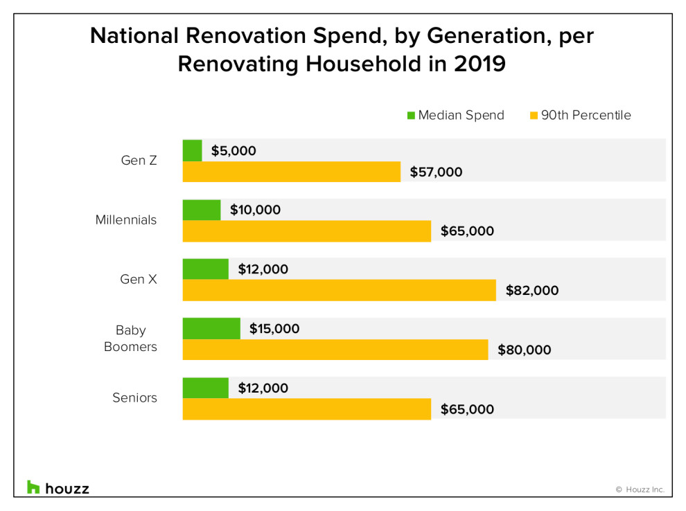 Baby boomers and Gen Xers drove the majority (85%) of renovations in 2019 and spent higher amounts on their projects compared with younger generations, according to the 2020 U.S. Houzz & Home study.