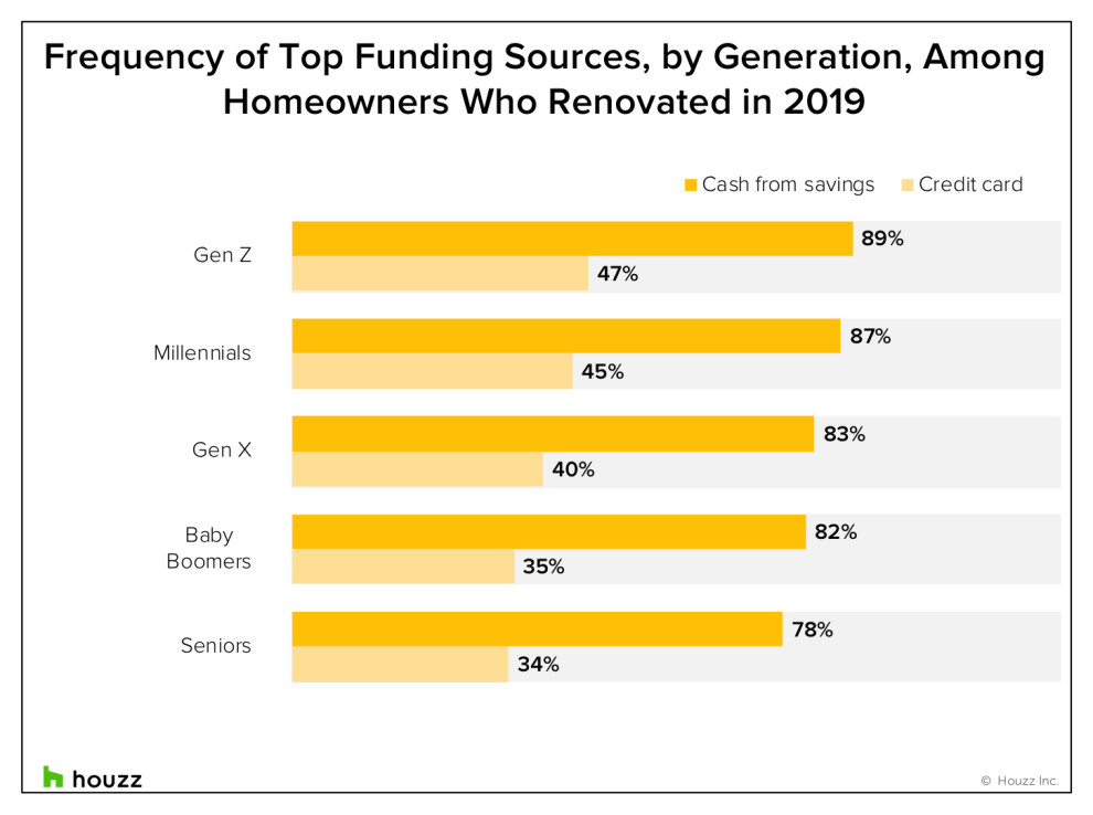 Cash from savings was the most popular payment method for renovating homeowners both young and old, the study found.