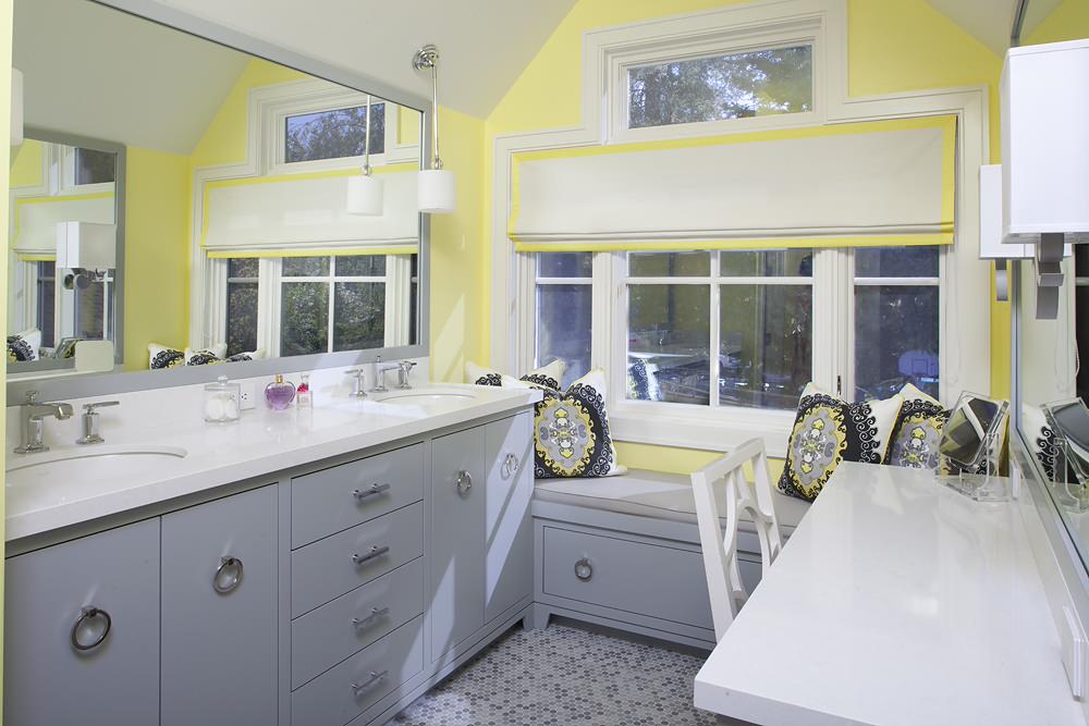 Now this is a bathroom made for taking a long soak in. The soft butter yellow walls mixed with white and the touch of light gray in the Carrara marble flooring form a very soothing and mellow palette.