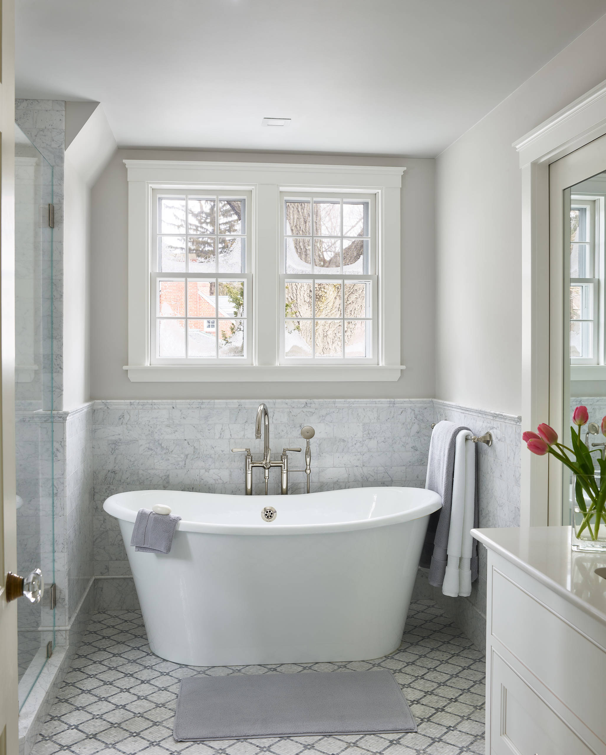 The expanded bathroom allowed for a larger shower and a freestanding soaking tub. “They always wanted this type of tub,” Haddad says. And while they didn’t want a claw-foot tub, they did end up choosing one made of cast iron (which they had painted white) to feel more authentic to the home. The new shower nestles into the corner near the tub, next to the gambrel roof.