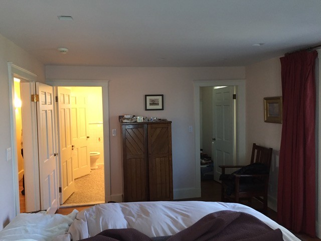 Before: The master bedroom had a door to the bathroom, seen at left, and a walk-in closet, at right. The homeowners wanted to better integrate the bathroom with the bedroom.