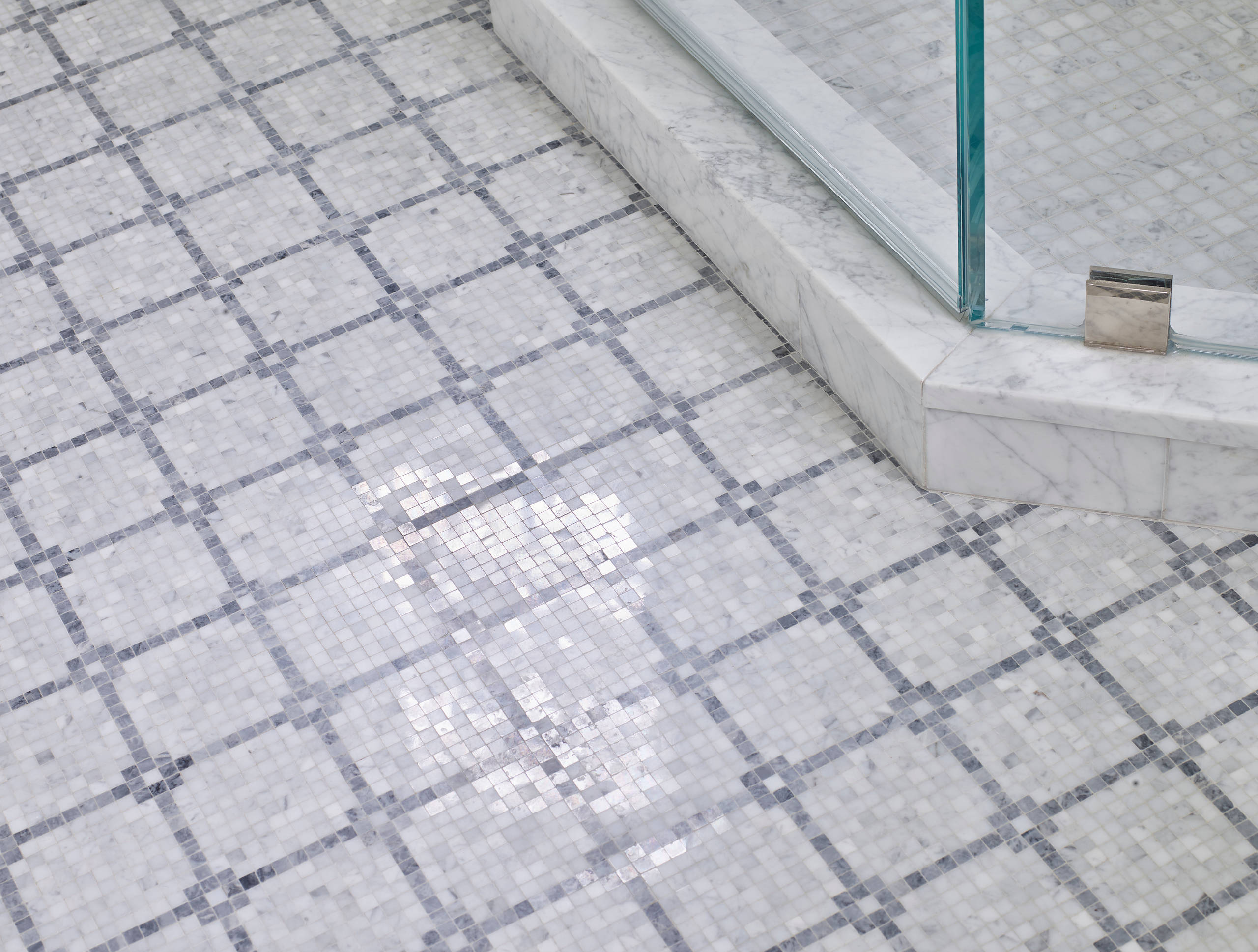 Carrara marble mosaic tile covers the floor, adding more pattern and texture to the space. “We were looking for marble mosaics,” both for aesthetics and for its lowered risk of cracking or separating (which an older home’s out-of-level floors could induce), Haddad says. The homeowners chose this pattern as soon as they saw it. “They never wavered,” he says.