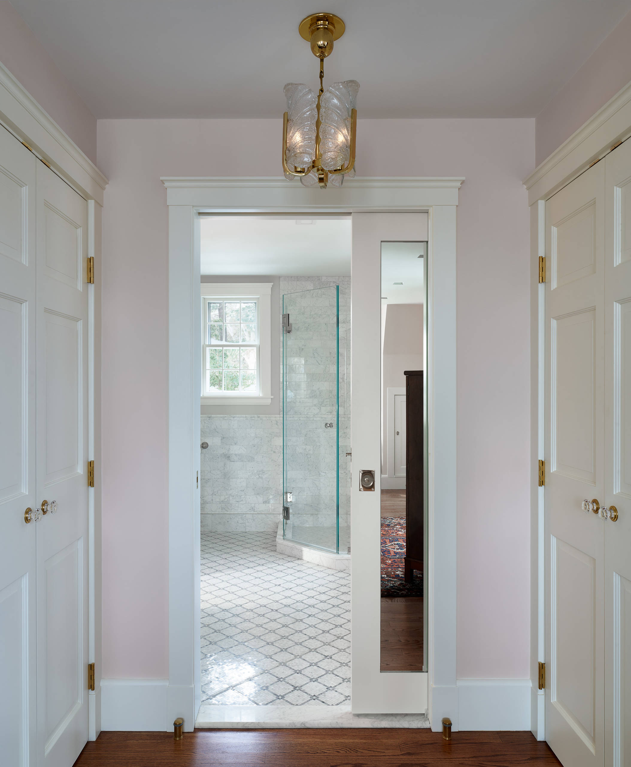 The wall with the armoire in the previous image is now the pocket door opening to the bathroom, with the dressing area open to the bedroom. “Incorporating the old walk-in closet into the master bath was the best decision. This allowed us to create the feel of an updated master suite,” Haddad says.