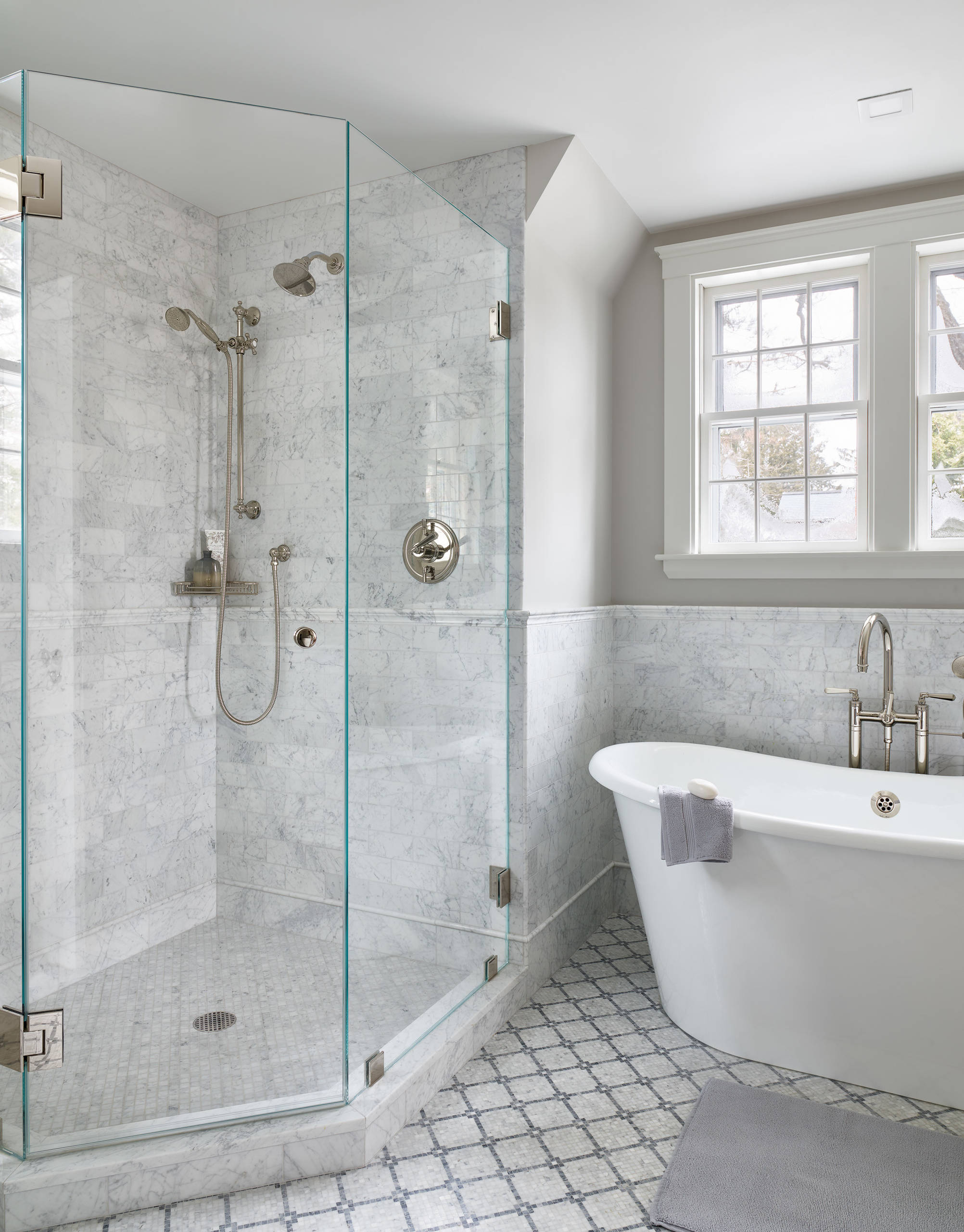 Wall and shower tile: Carrara marble; shower fixtures: California Faucets; bathtub: Beardsey 59-inch, Penhaglion; see more freestanding tubs