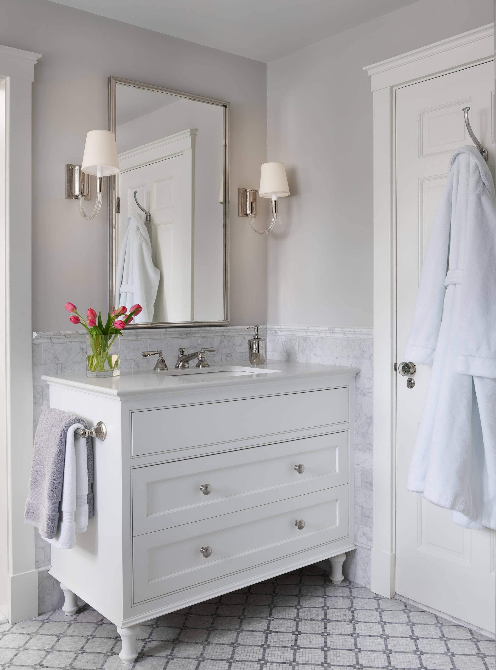 By the time they hired Interiology Design, the couple had a pretty clear view of what they wanted for their bathroom overhaul. In addition to expanding the room’s roughly 40-square-foot footprint, they also envisioned a more elegant, timeless space that wouldn’t feel out of place in a nearly 100-year-old home. “Their aesthetic and their style was really to capture the traditional New England home,” designer Mark Haddad says.