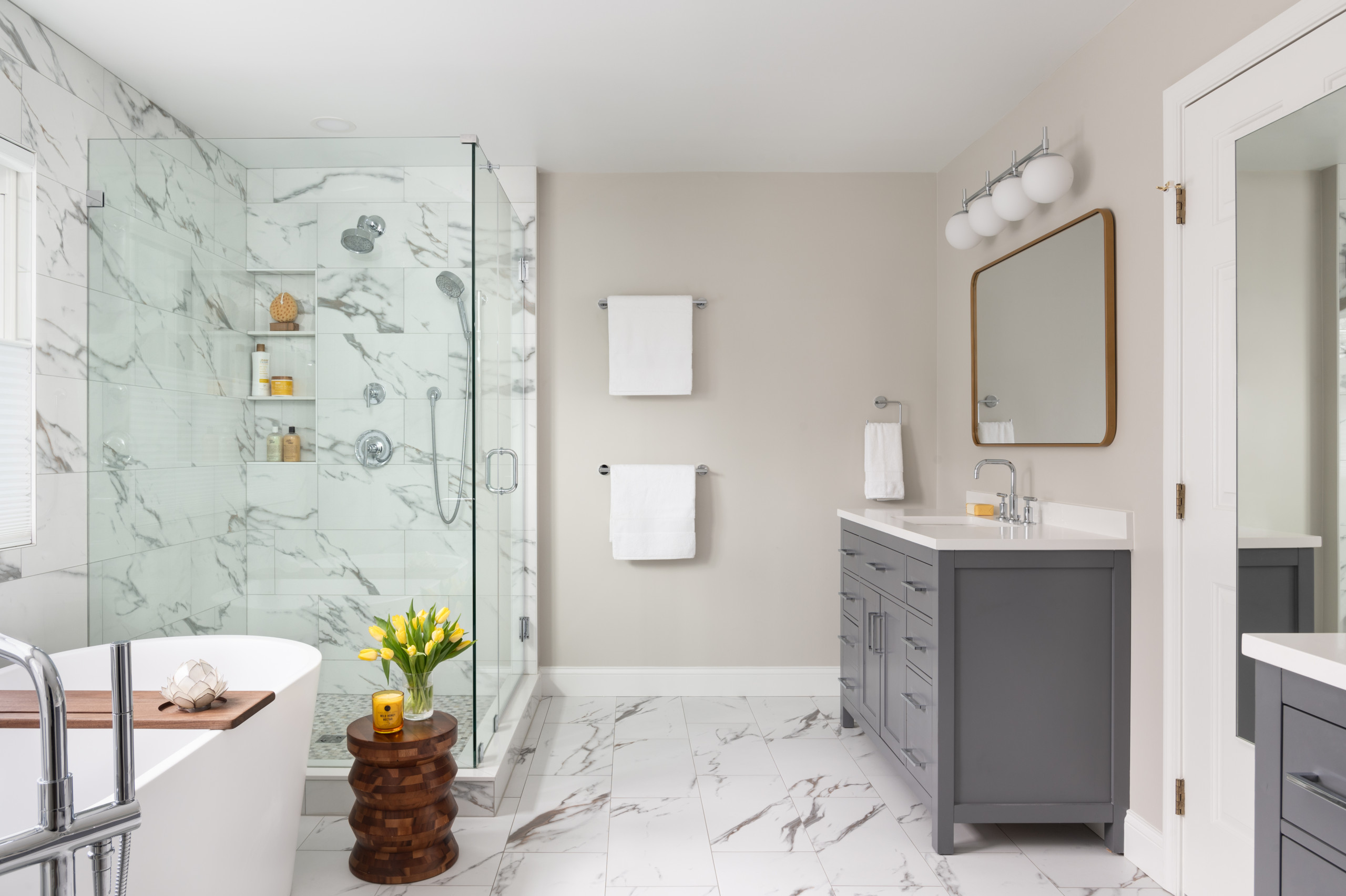 The remodeling team replaced the built-in tub with a freestanding model that helped loosen up the layout and allow for a bigger shower. White marble-look porcelain tiles cover the floor and the walls wrapping the shower and tub area, creating a brighter look. Pale gray walls also brighten the space, while midtone gray vanities and chrome fixtures and details add touches of fresh, modern style.