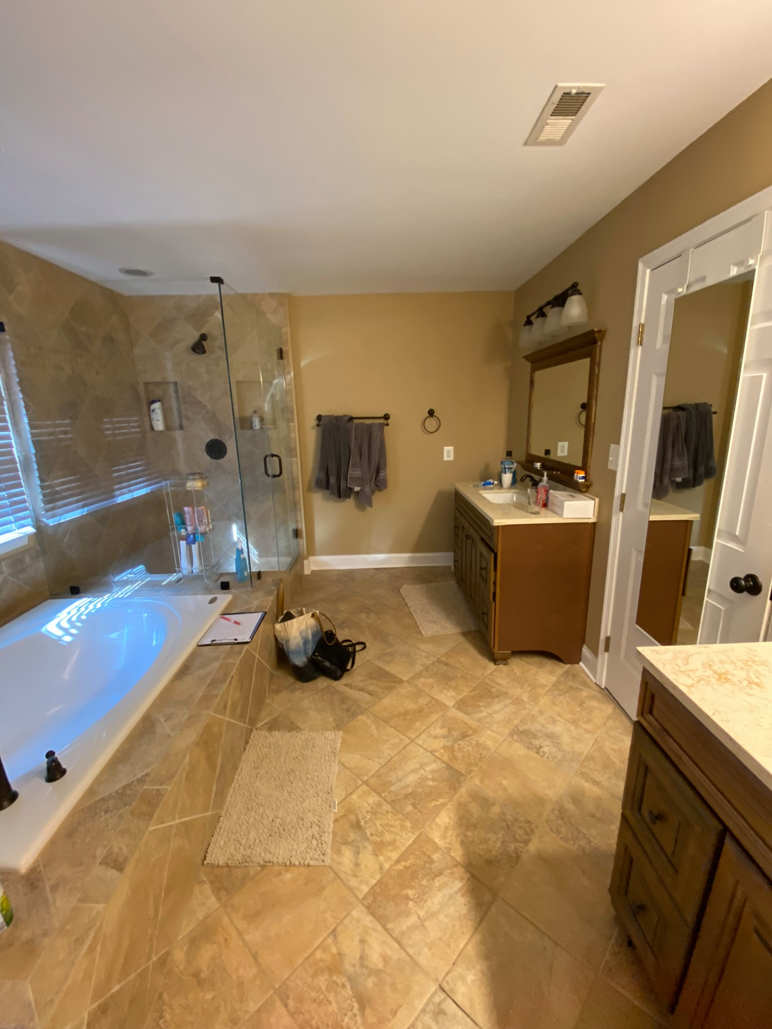 Before: In the former bathroom, travertine tiles covered the floor, tub deck and walls wrapping the tub and shower. Combined with tan surrounding walls and stained wood vanities, the space looked dark and heavy. “It had previously been refinished, and it was all very tan and brown,” Michael says. “We wanted something that looked clean and a lot brighter.” Meanwhile, the built-in tub ate up valuable square footage.