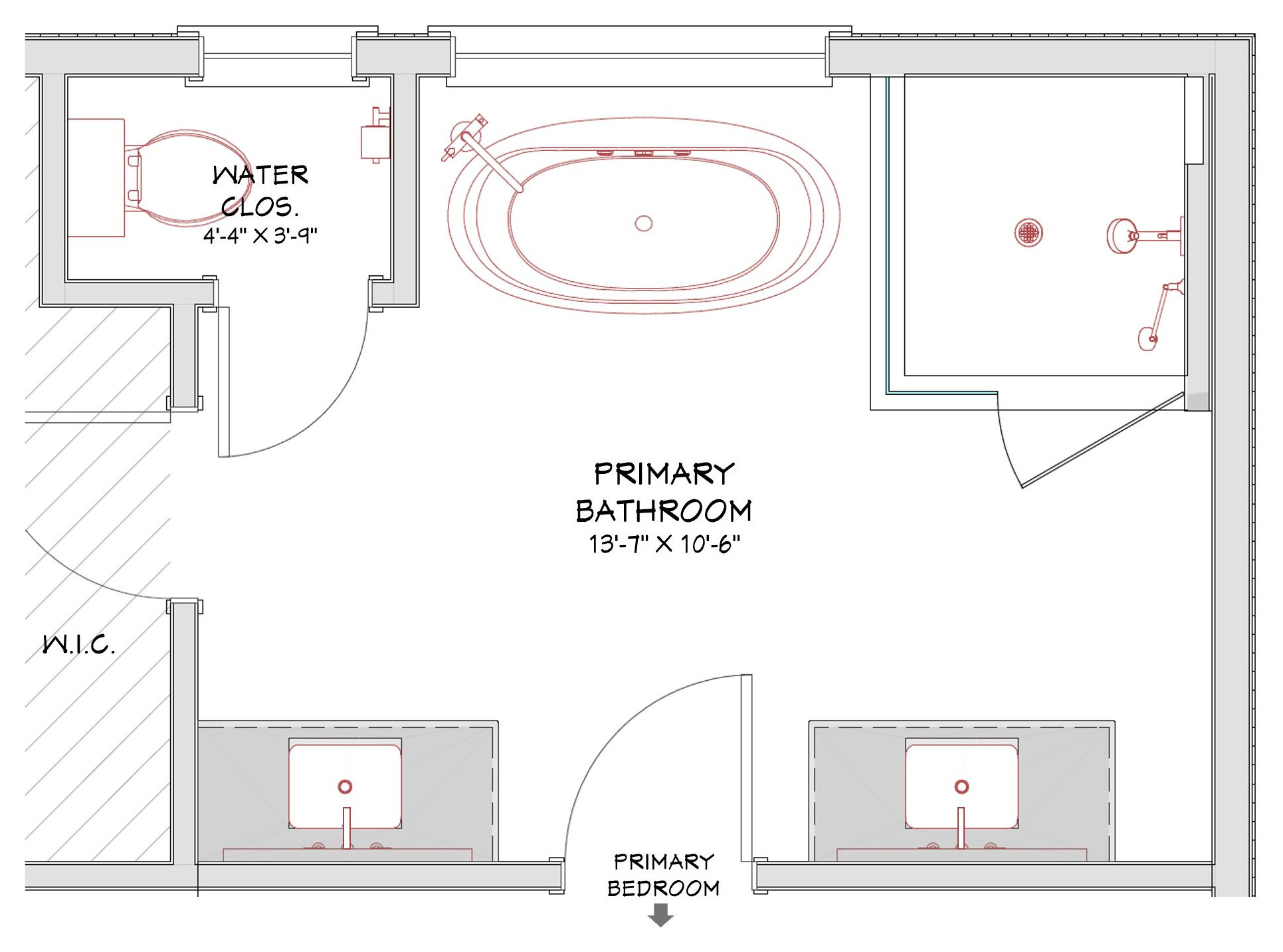 This floor plan shows the updated bathroom layout with the shower stall (top right), freestanding tub (top center) and water closet (top left) along one wall. The two vanities flank the door leading to the bedroom (bottom center). On the far left, another door leads to a walk-in closet.