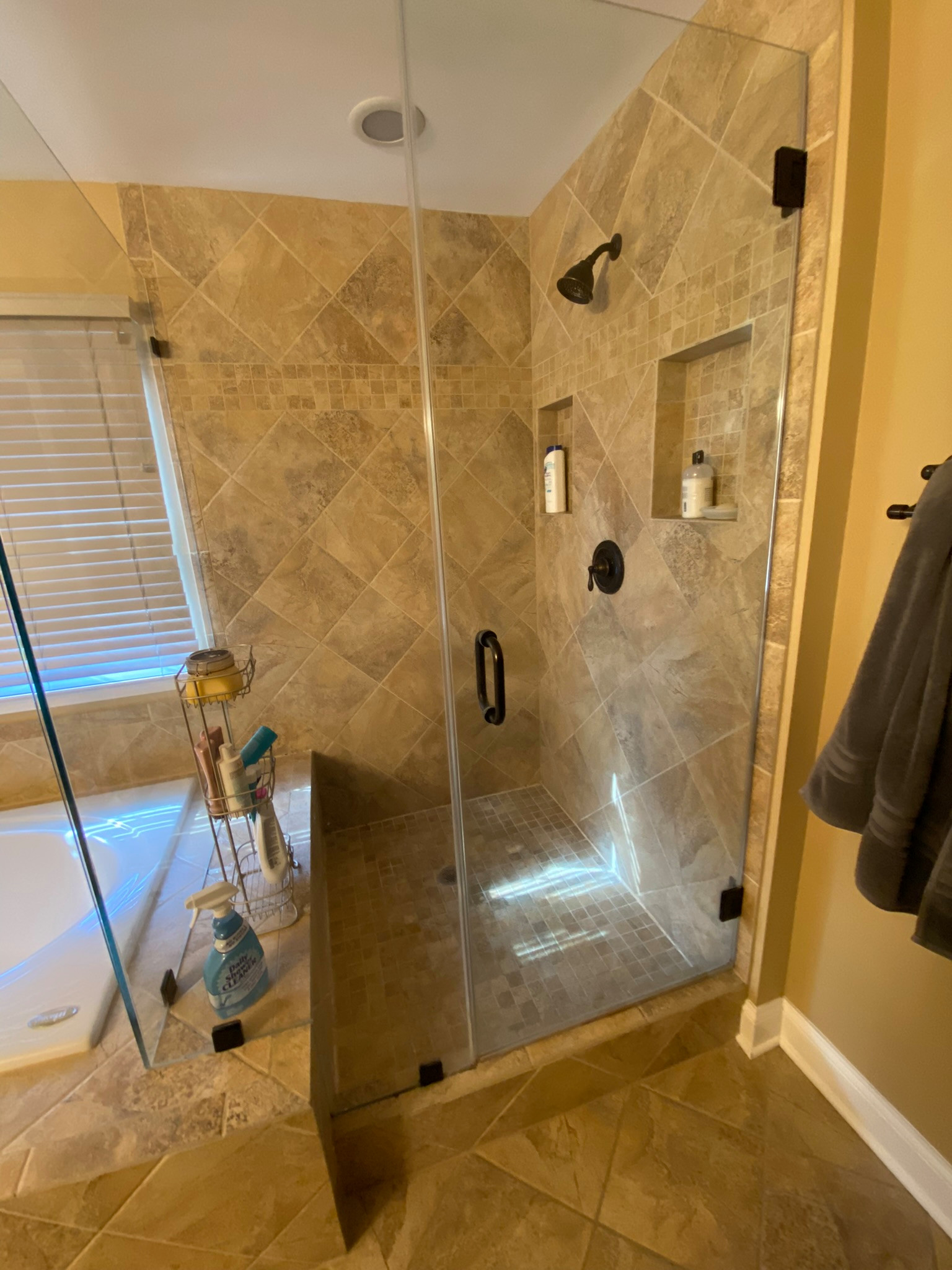 Before: Previously, the imposing tub deck protruded into the shower to form a bench, which the couple felt took up too much room. “It came in there and really reduced the floor space inside the shower,” Michael says.
