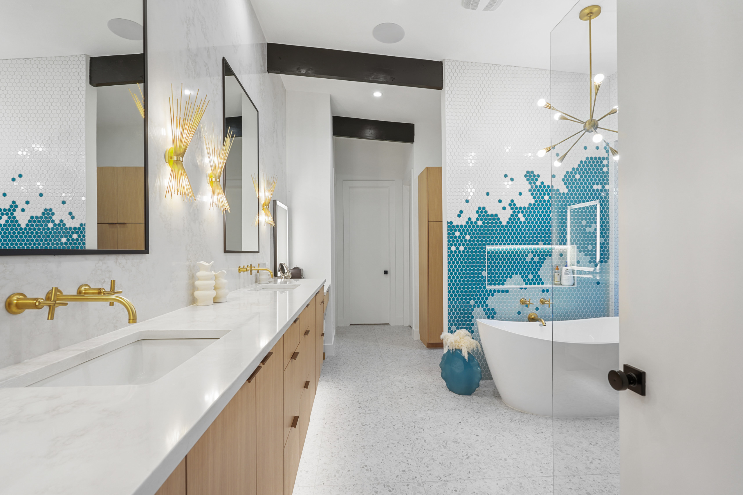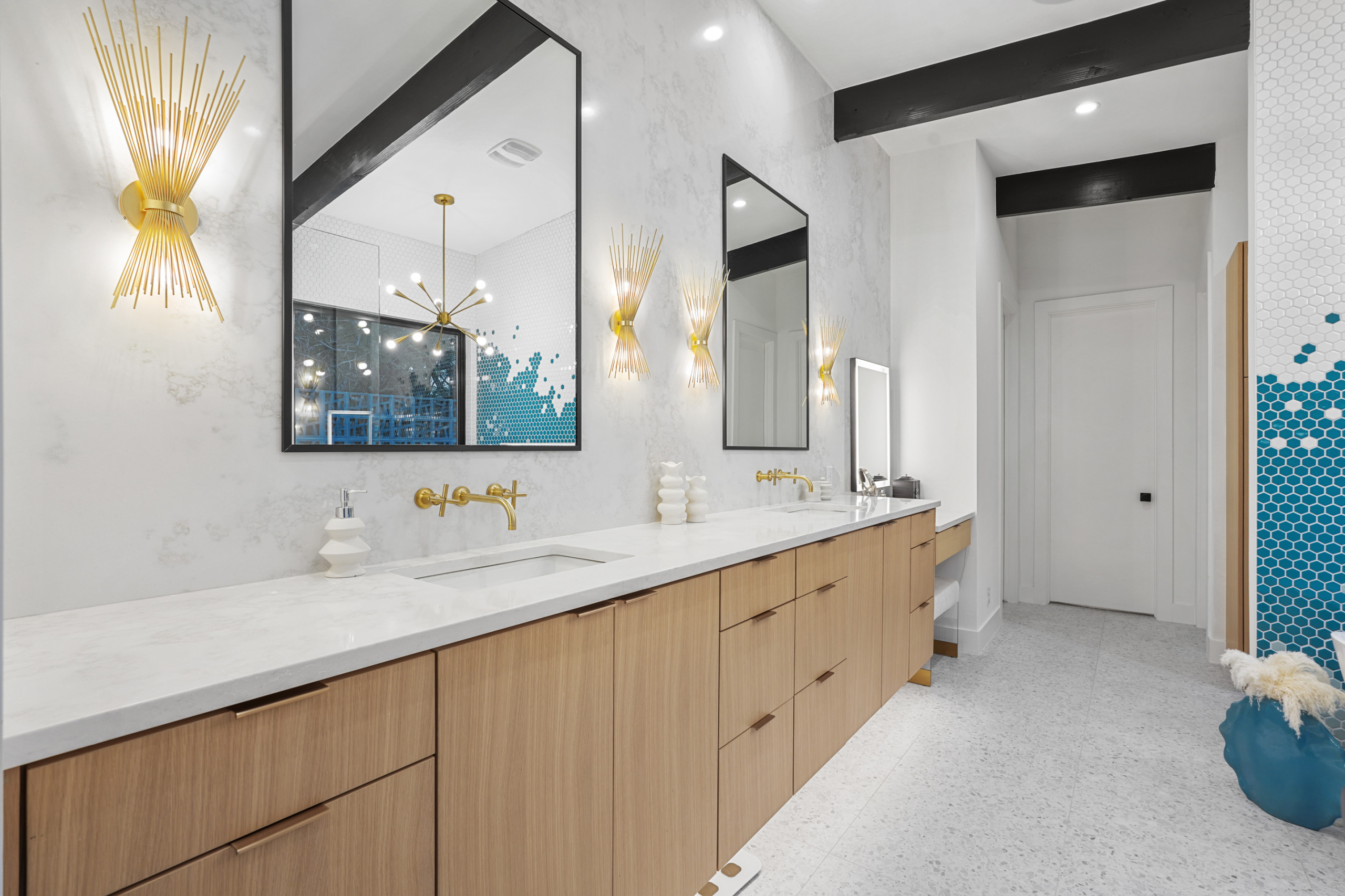 Simple mirrors, linear drawer pulls and sunray sconces continue the era’s influence, while brass plumbing and lighting finishes brings in a touch of retro elegance.