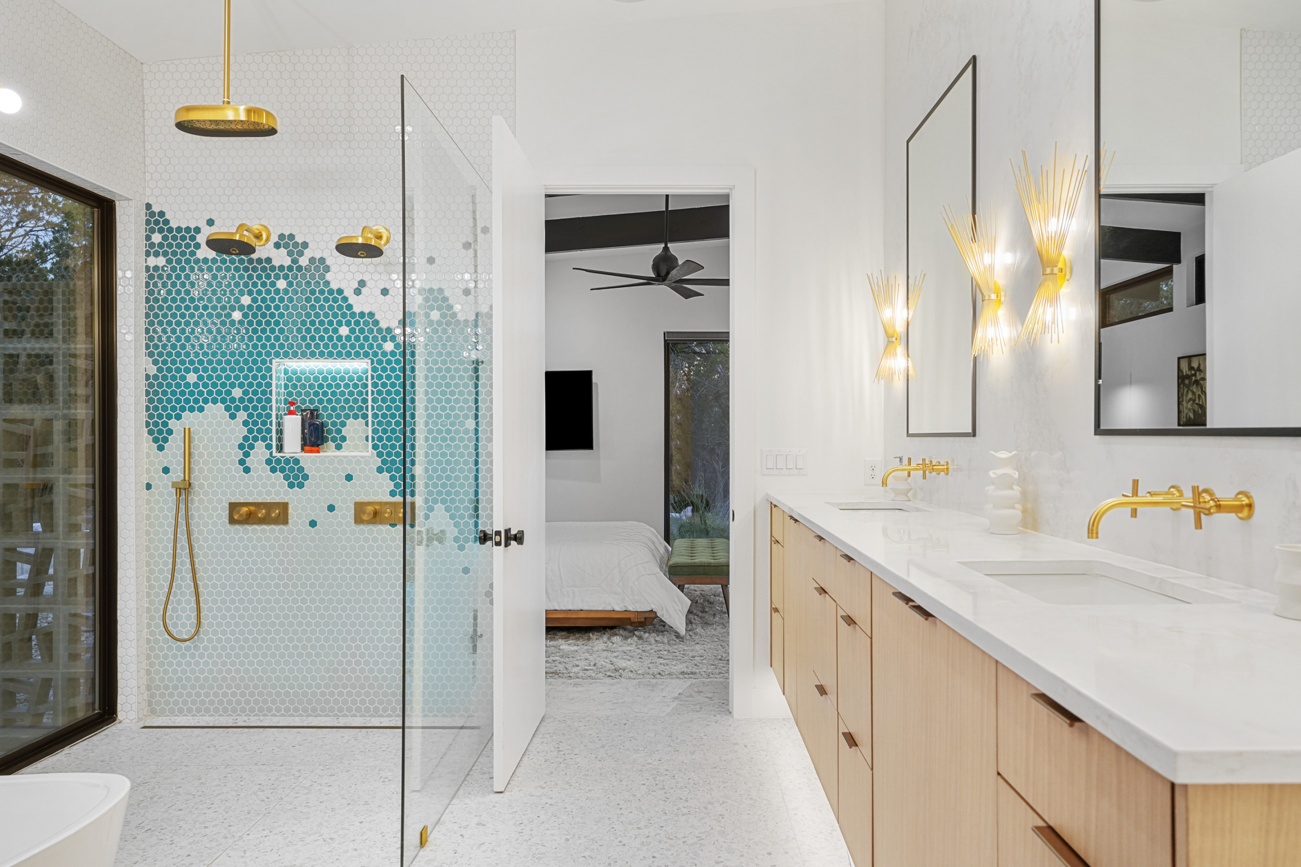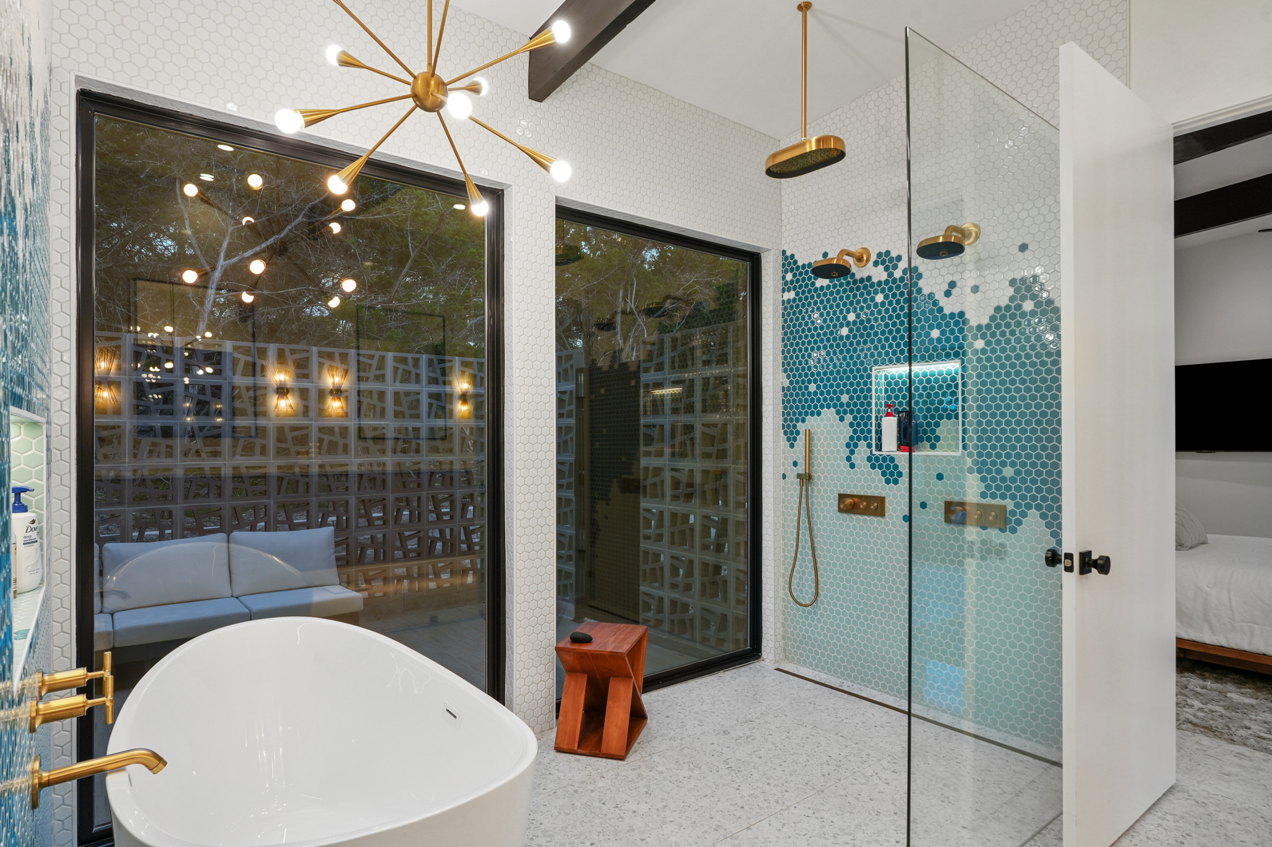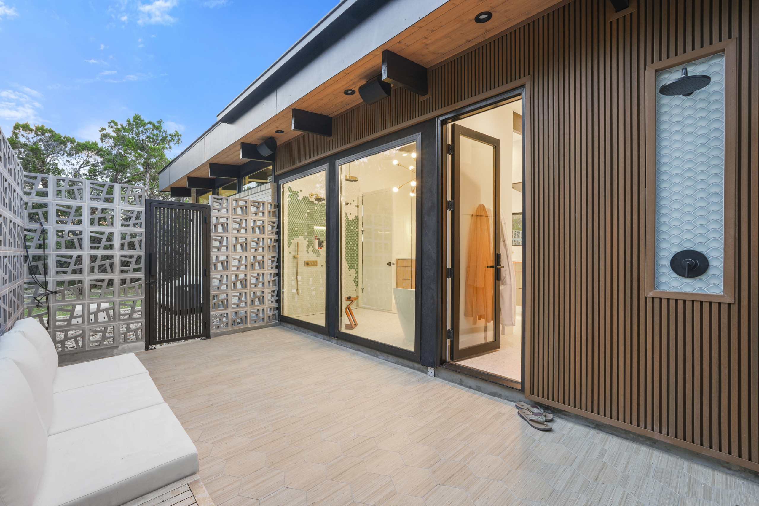 The patio’s hexagonal porcelain tiles echo the geometry found inside, their bamboo-like texture adding a soft, organic touch against the slatted wood siding. A playful accent of geometric tiles behind the outdoor shower ties everything together.