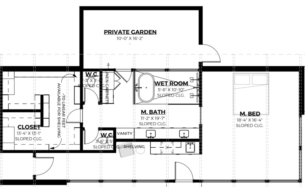 Floor plan: The plan shows the primary suite, with the bathroom in the center, the private patio at the top, the closet on the left and the bedroom on the right. Two private toilet rooms are on the left side of the bathroom.