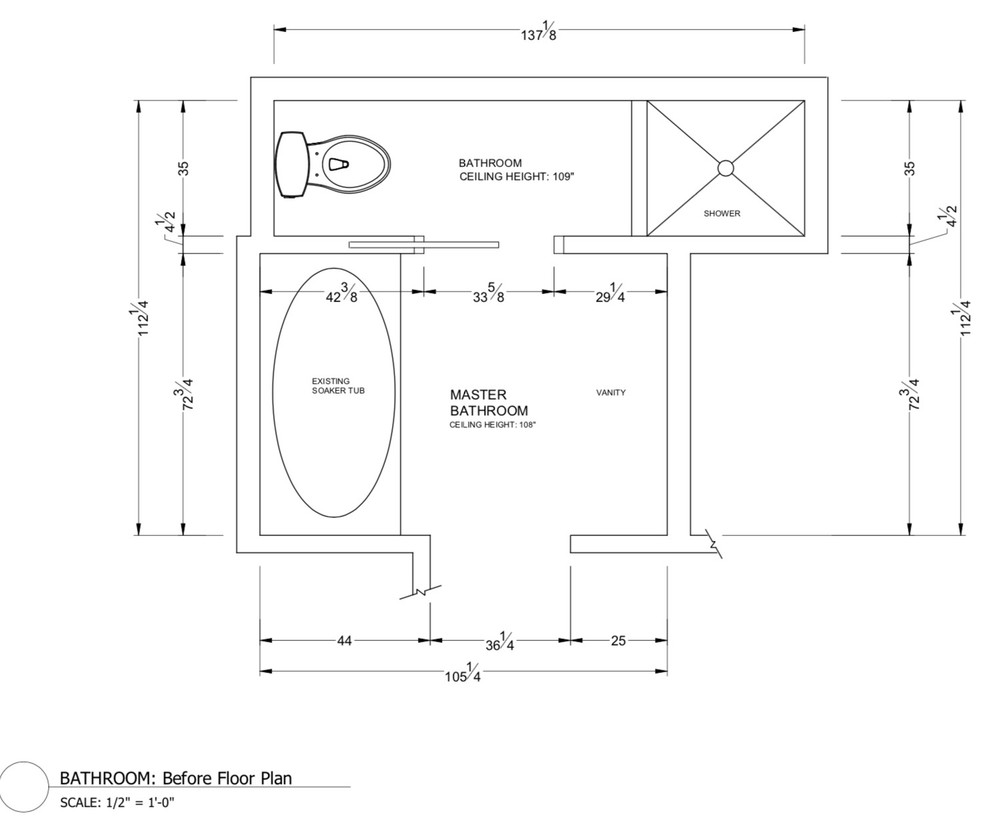 Before: This floor plan lines up nicely with the previous photo. There was a tiny shower stall in the top left corner. And the dividing walls between the toilet and shower were not practical for aging in place.