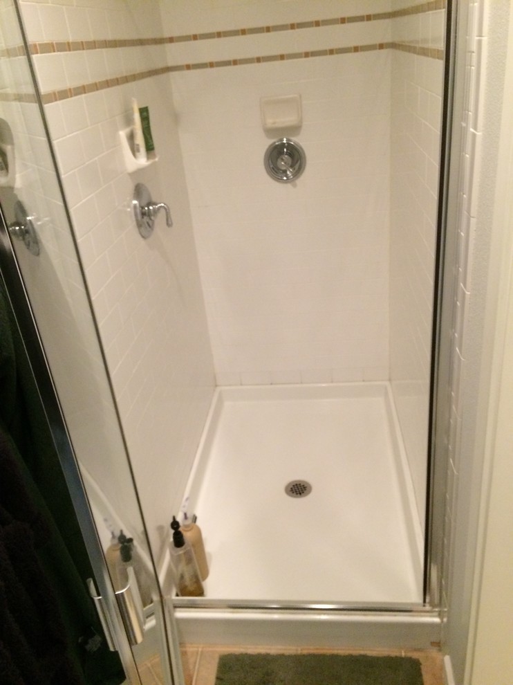 Before: The shower stall was small and had a curb — not conducive to aging in place.