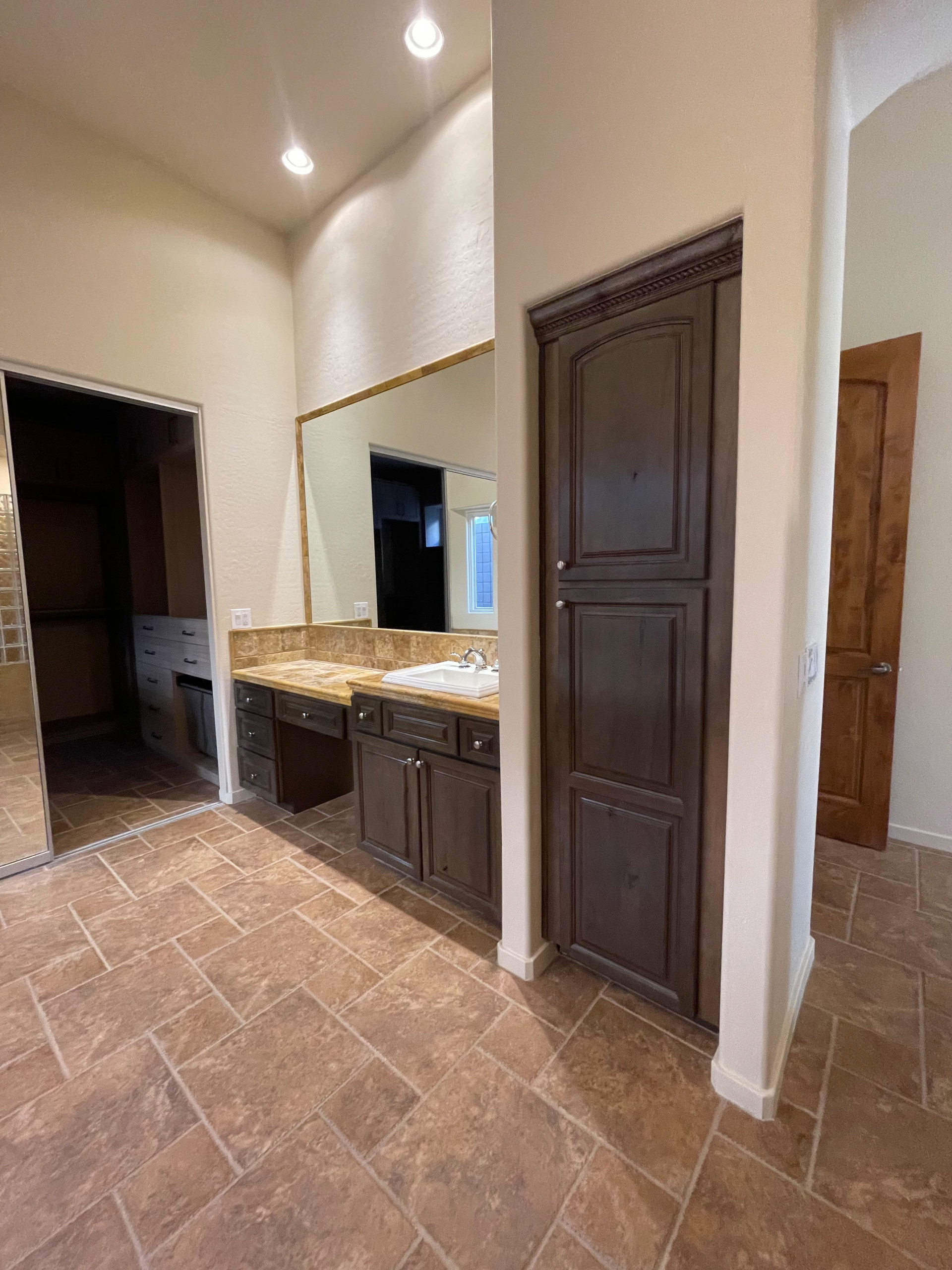 Wanting an escape from harsh winters at home in Minnesota, this couple purchased a second home in Scottsdale, Arizona. While the house had great bones, its heavy 1990s Tuscan-inspired style didn’t align with their vision of a calm, relaxing desert haven. They also wanted to experiment with a style different from their traditional Minnesota home. “They wanted this house to be a little more modern and have a European feeling,” says interior designer Maya Axt, who worked on the entire house. “They wanted their bathroom to feel like a calm and welcoming place to start and finish their days.”