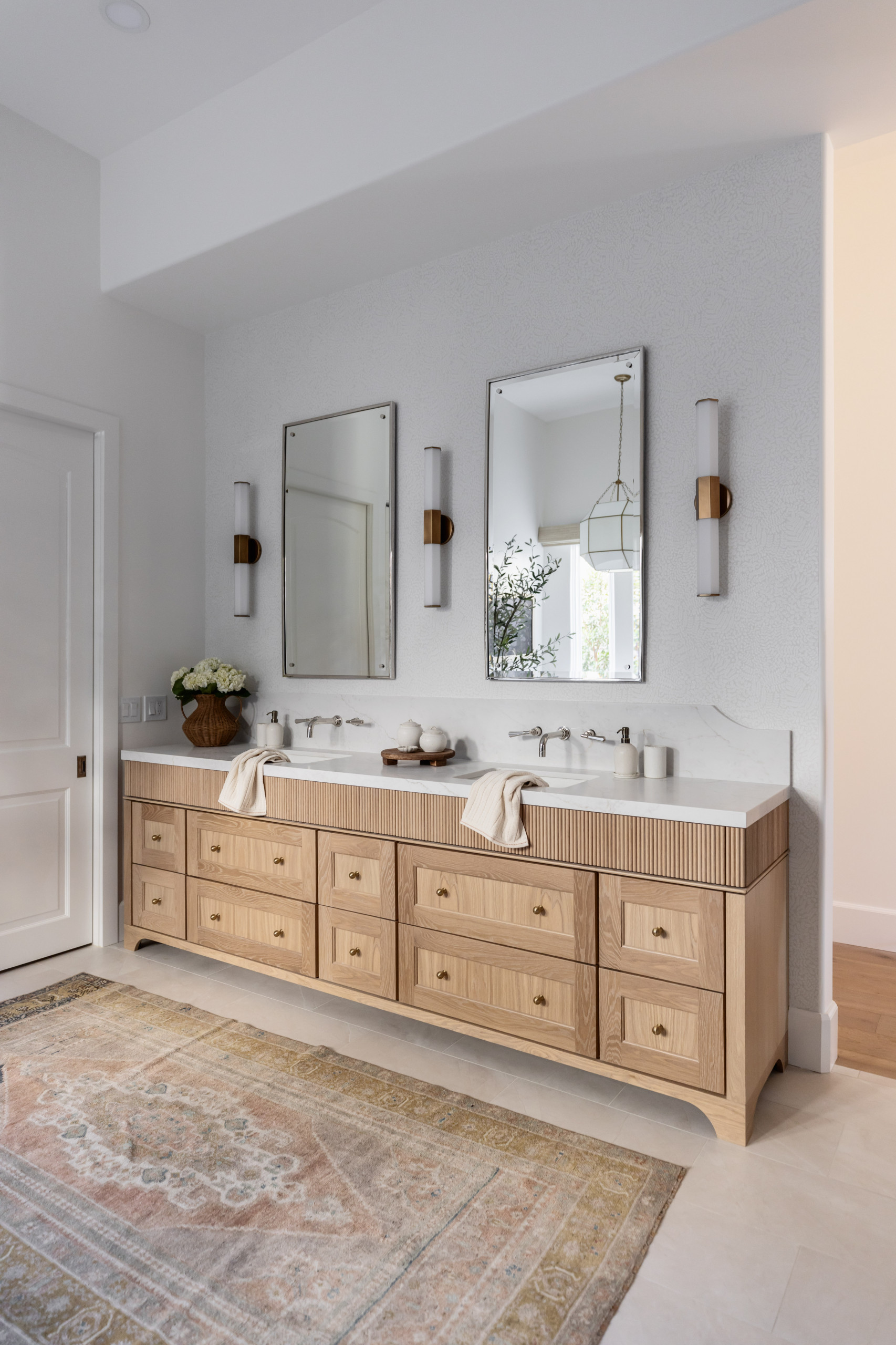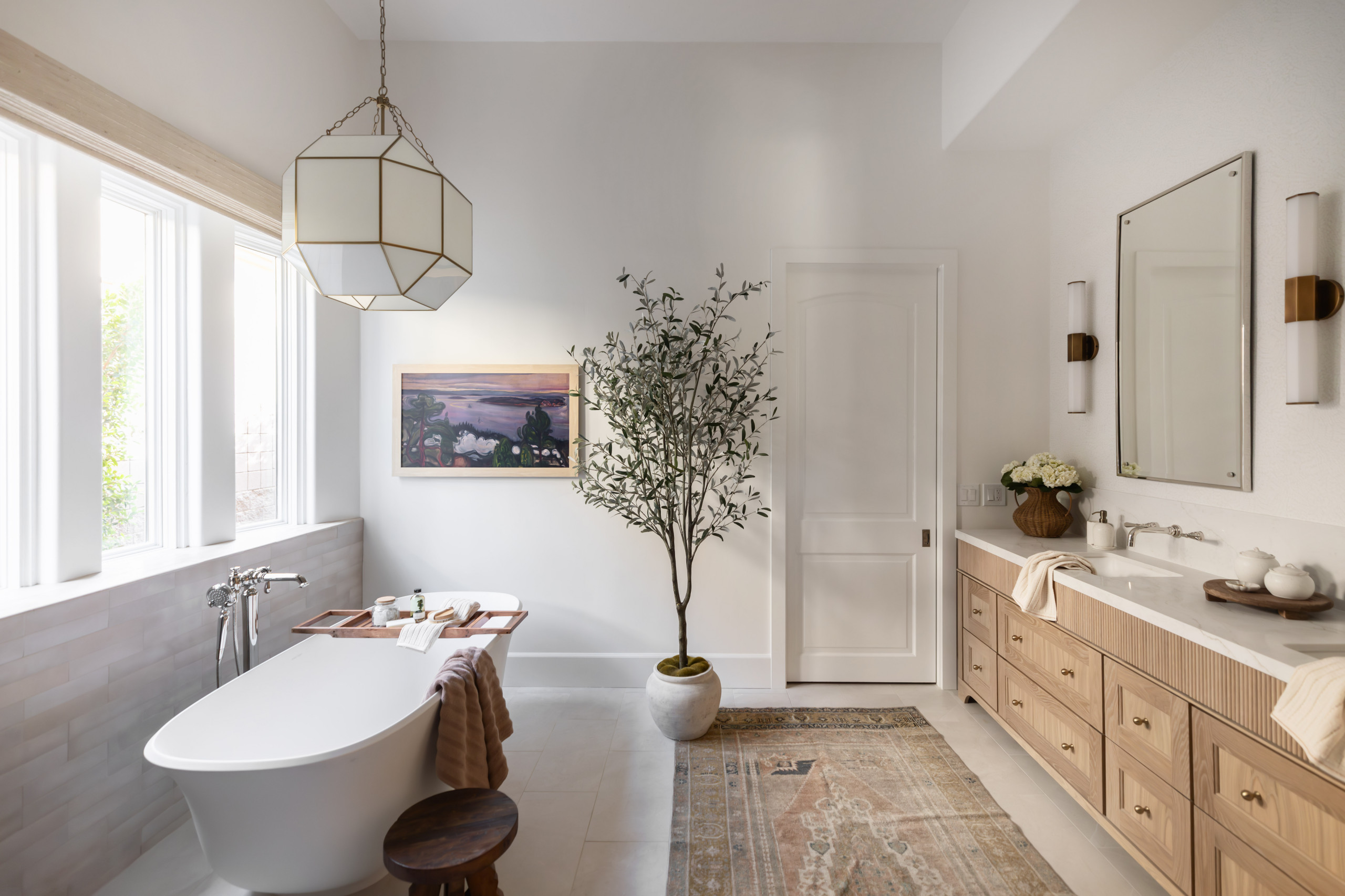 Furniture-inspired details such as graceful feet and a rounded corner backsplash add softness to the vanity. Paired with the Turkish rug, these touches contribute to the room’s European sensibility. Clean-lined mirrors and long, hexagonal sconces introduce modern contrast. Their tall proportions balance the high ceiling, while their shapes echo the geometric pendant light above the tub.