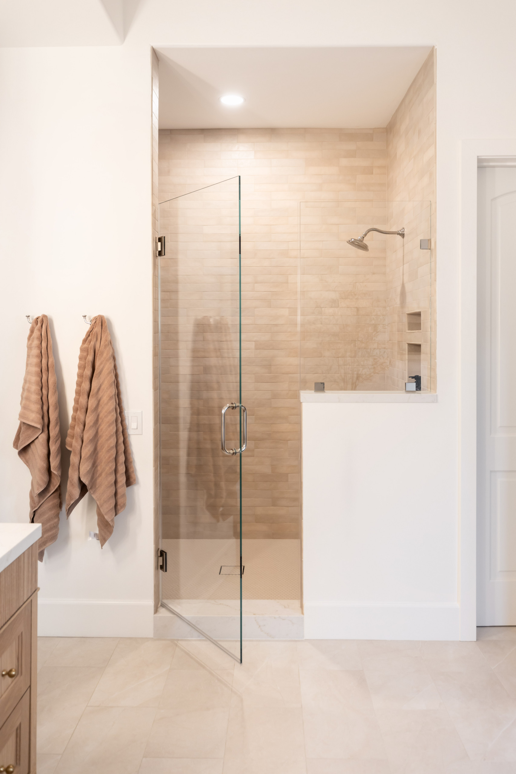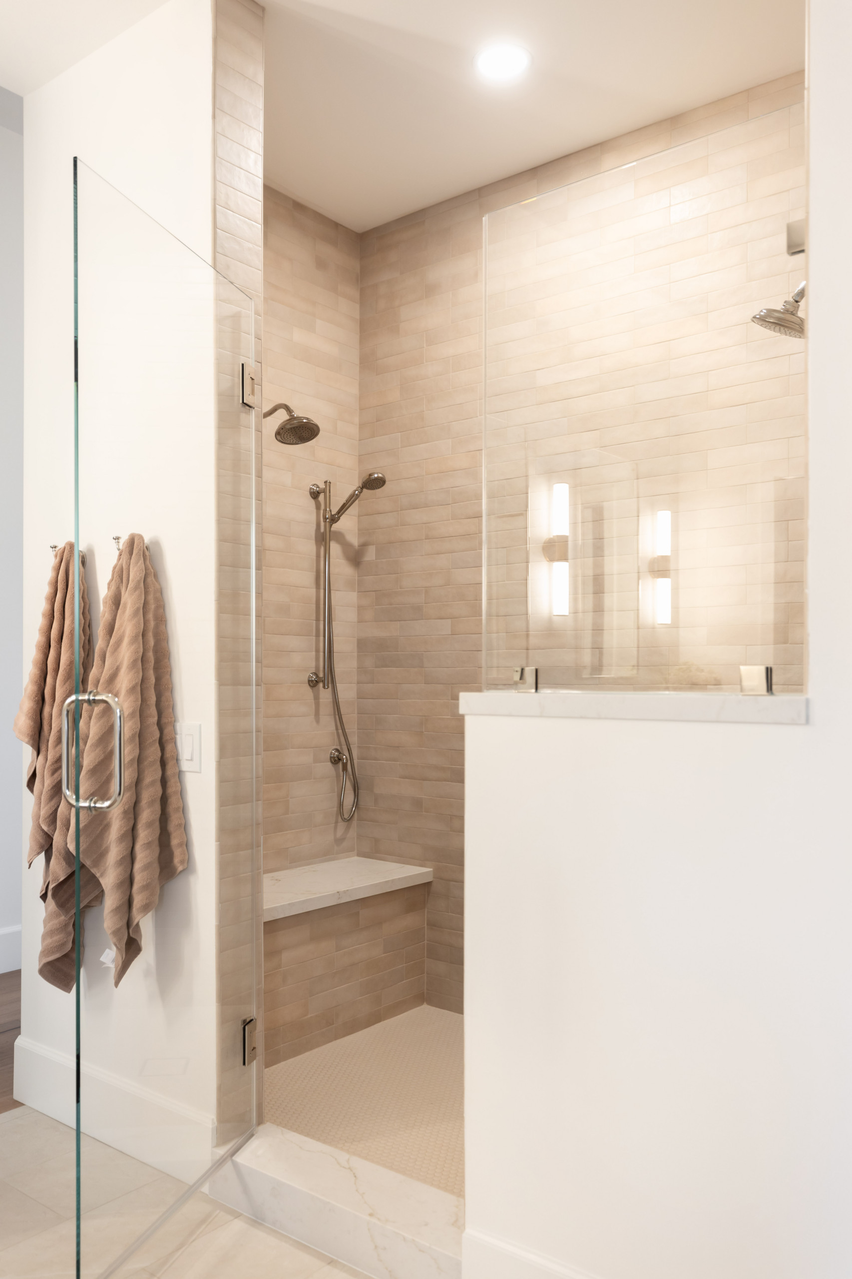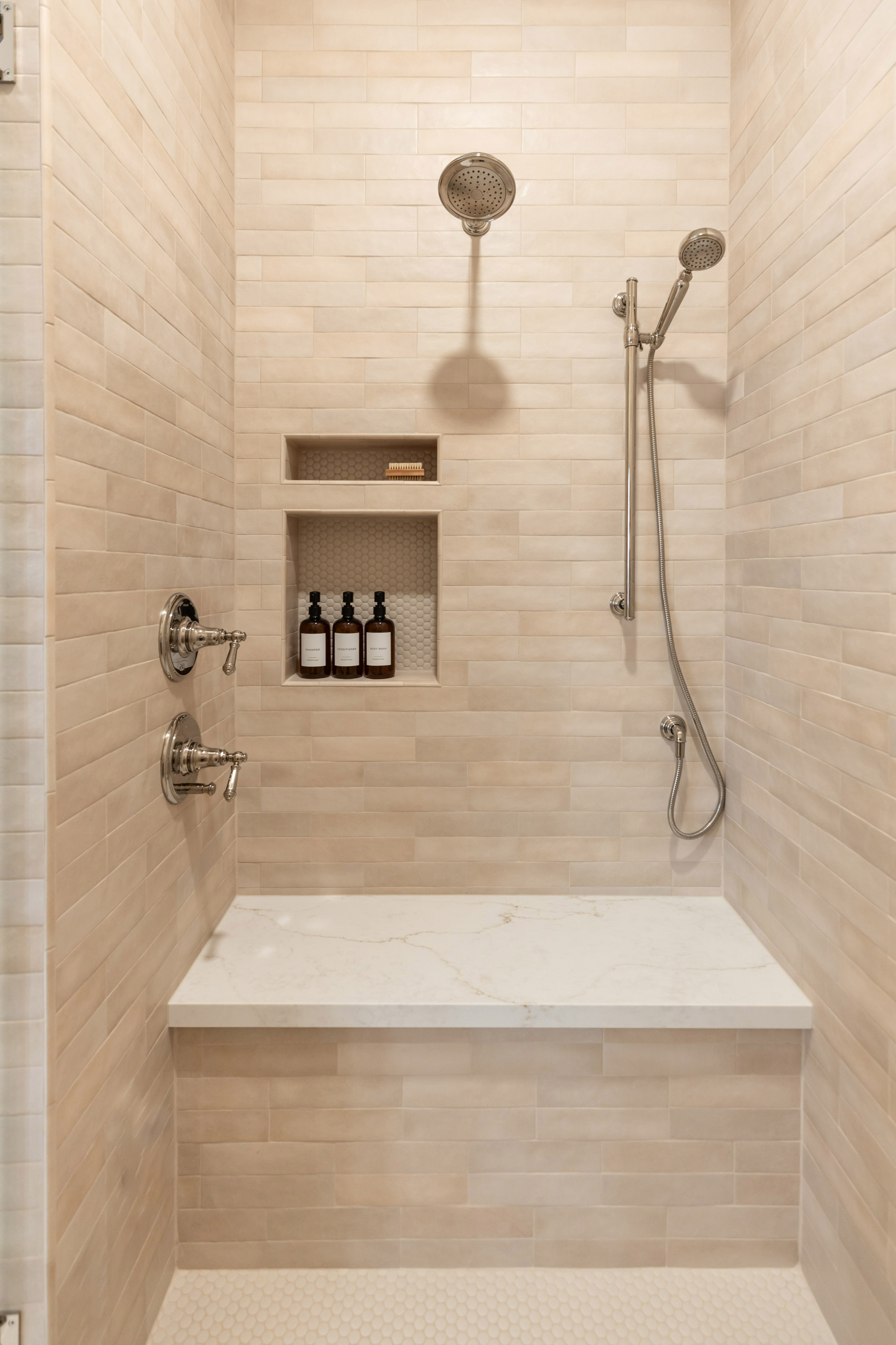 After: The shower wall tile matches the tile behind the tub, with tan and cream tones continuing the warm, soothing palette. The new space includes double shower heads, a handheld wand and a bench. Axt positioned the control valves so the homeowners can turn the water on without getting wet.