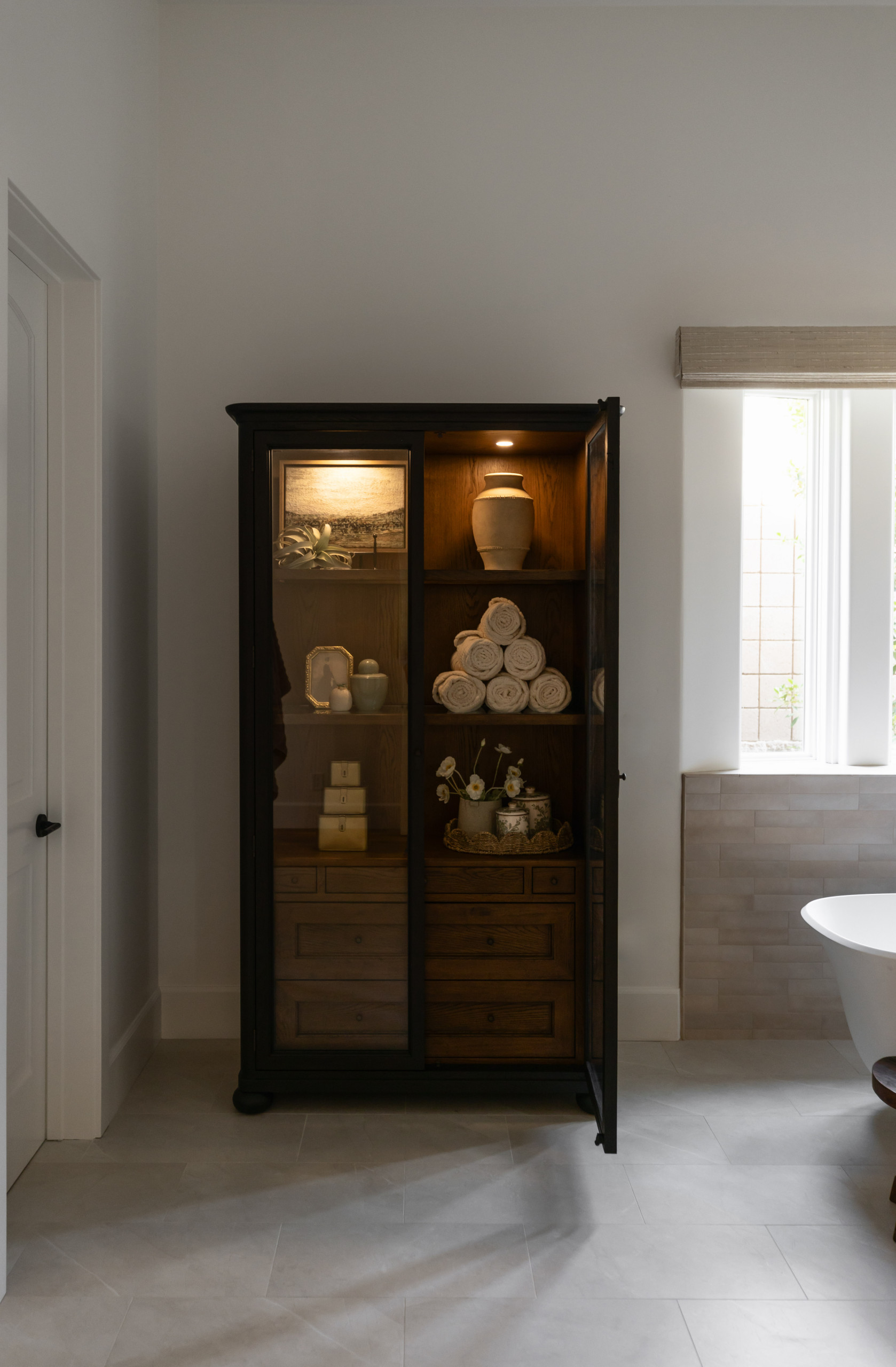 To replace the removed linen closet, Axt added a freestanding cabinet where the second vanity once stood. The dark wood adds contrast to the light palette, while glass doors and integrated lighting highlight decorative items. Drawers below discreetly hide necessities.